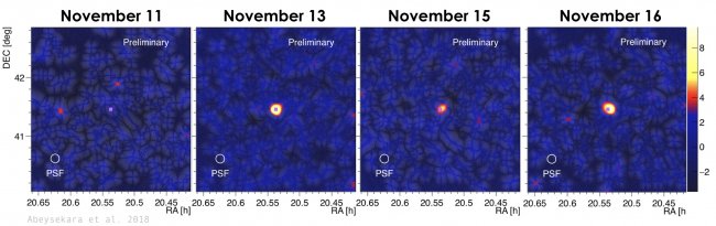 Binary emission according to MAGIC on different days during the approach in November 2017. Crédito: MAGIC Collaboration