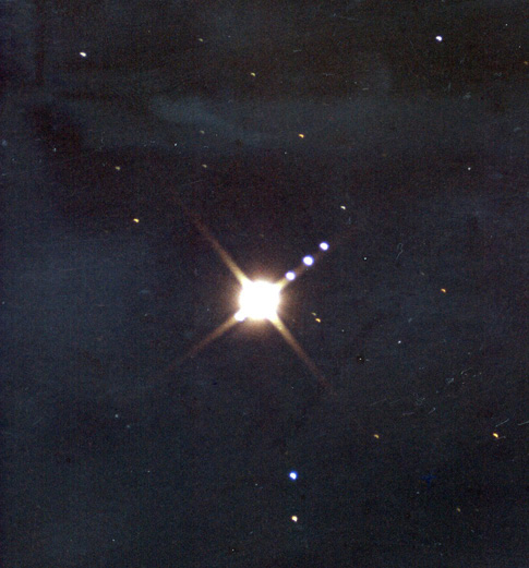 Over exposed photograph where Jupiter satellites can be observed at both sides of the planet.
