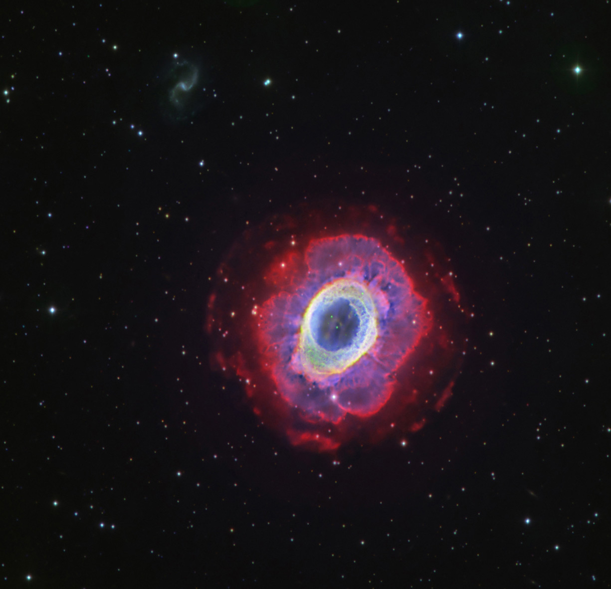 La Nebulosa del Anillo, M57, localizada en la constelación de La Lira y descubierta en 1779 por Darquier de Pellepoix, suele representarse como el prototipo de nebulosa planetaria. Este tipo de objetos -bastante comunes en nuestra galaxia- se forma cuando una estrella no puede soportarse a sí misma debido a los procesos de fusión que tienen lugar en su interior. La gravedad del material en sus capas más externas fuerza a que su parte interna se condense y se caliente. Con esto, las altas temperaturas de las regiones centrales producen la pérdida de una parte importante de la estrella en forma de vientos estelares que pueden tener lugar durante unos cuantos miles de años. Cuando el proceso se completa, el núcleo remanente queda \\"al descubierto\\" y calienta los gases que ahora se encuentran dispersos, haciendo que estos brillen. En el caso de M57, la burbuja de gas se encuentra a más de 2000 años luz y tiene más de 1 año luz de diámetro, con un halo que se extiende hasta los 2,4 años luz. Su apariencia de anillo no es real, sino que la nebulosa es realmente un caparazón esférico.