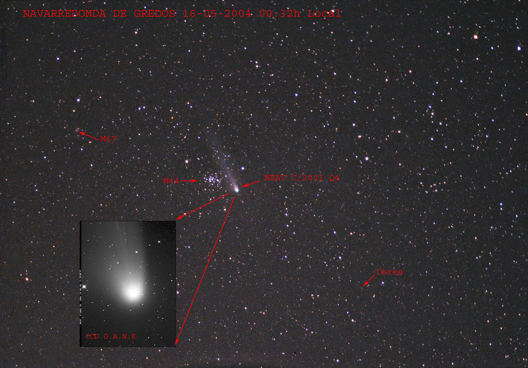 This image shows comet Q4, discovered in 2001 as a result of the Near Earth Asteroid Tracking program (NEAT). The comet got closest to Earth in May 2004, and in this photograph we can see it in the proximity of the Praesaepe open cluster, M44. Open cluster M67 and dwarf planet Ceres can also be recognized in the image.