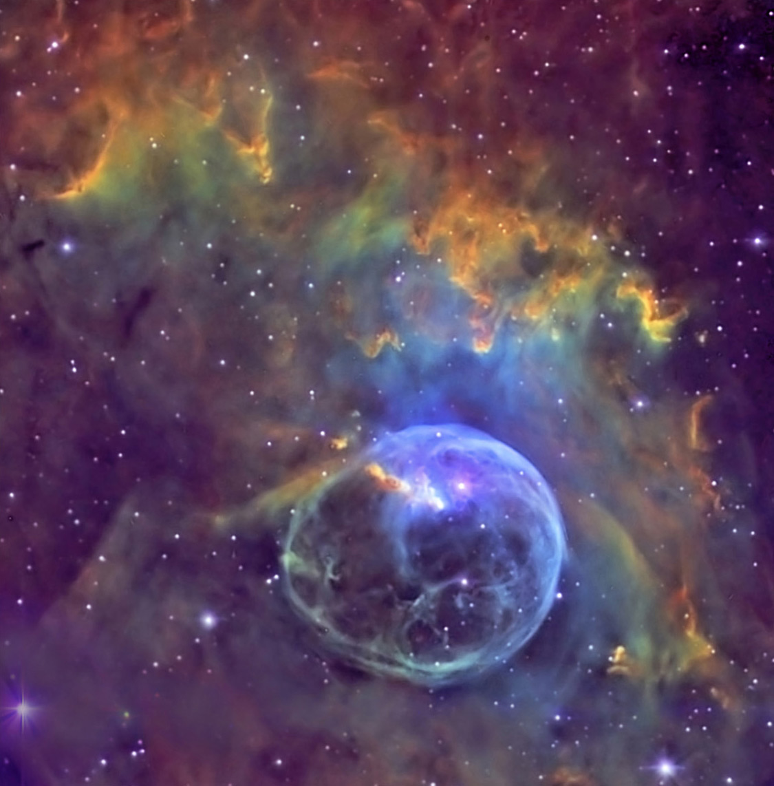 Realmente, la nebulosa de la burbuja es la más pequeña de otras tres que rodean a la estrella emisora, visible en la parte superior dentro de la burbuja. Éstas forman a su vez parte del complejo de red de burbujas S162.