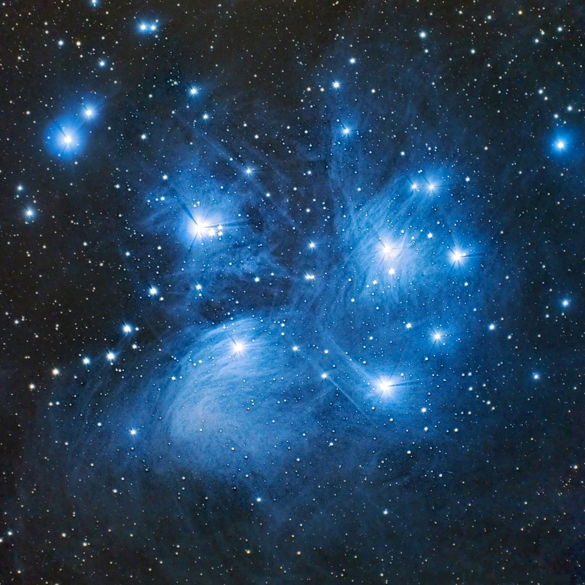 Las Pléyades o M45, también conocidas como ?Las siete hermanas?, es un cúmulo abierto de estrellas observable a simple vista, aunque es a través de unos prismáticos o de un pequeño telescopio cuando ofrecen su imagen más espectacular.
