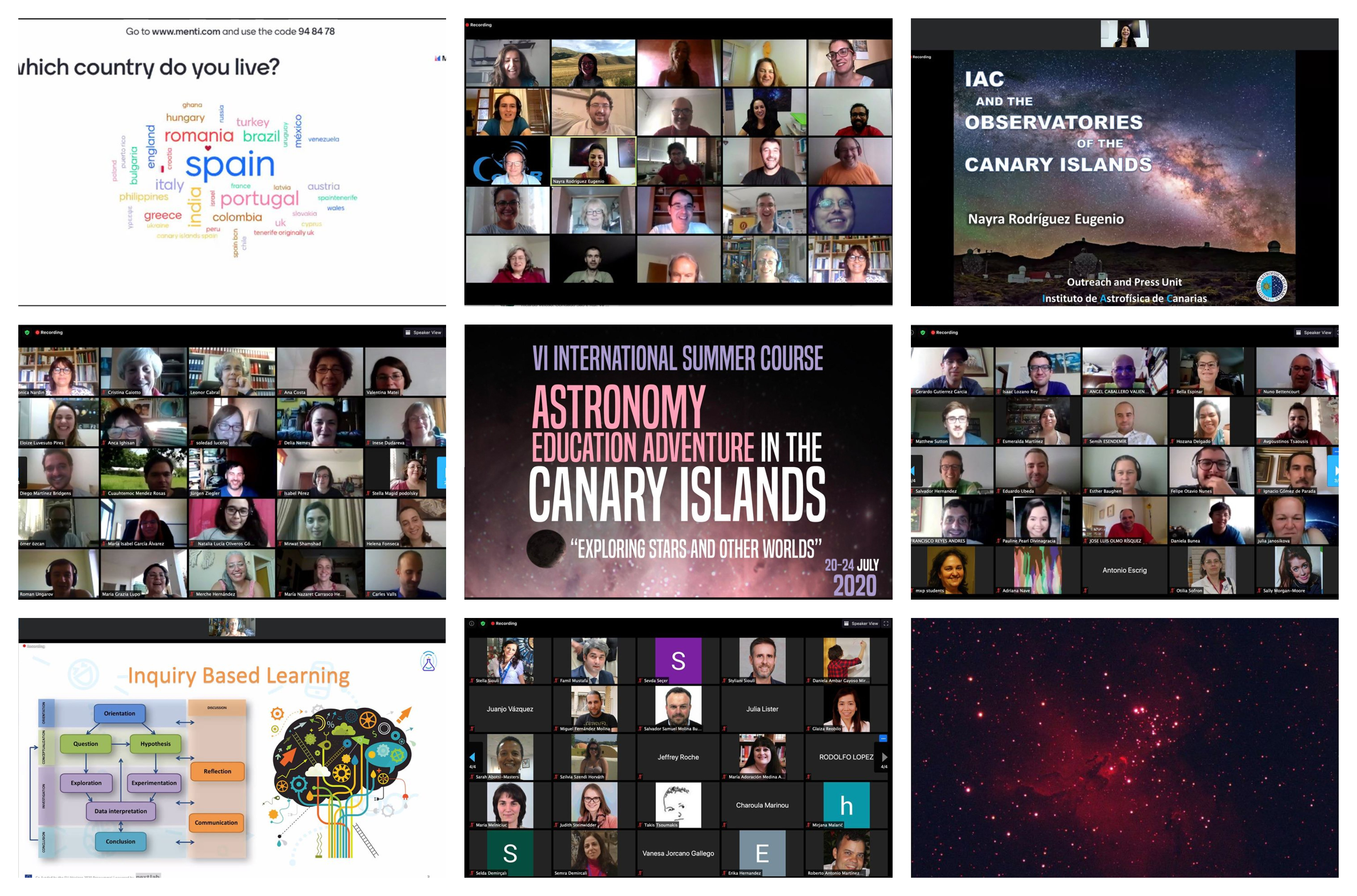 Mosaico de fotos del curso virtual "Astronomy Education Adventure in the Canary Islands 2020" Download Mosaico de fotos del curso virtual "Astronomy Education Adventure in the Canary Islands 2020" Created at 07/29/2020 Obtained at Sede Central Category Eventos y actividades Astrofísica Divulgación Formación PETeR