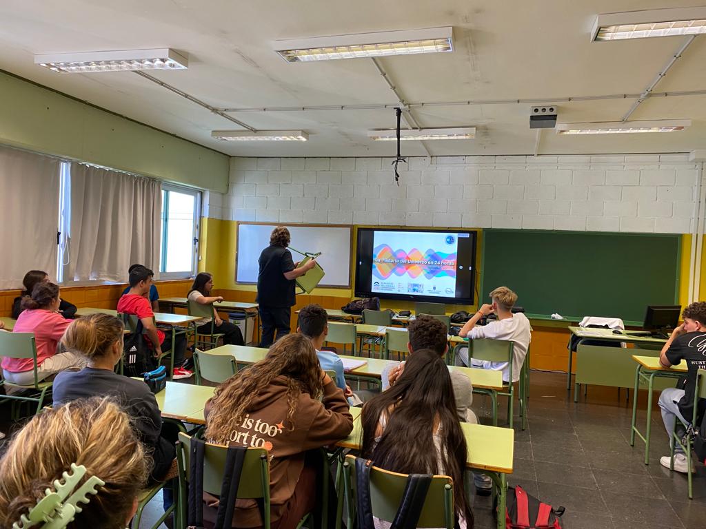 Attendees at the talk "The history of the Universe in 24 hours" at IES Prof. Martín Miranda. Download Attendees at the talk "The history of the Universe in 24 hours" at IES Prof. Martín Miranda. Credit: Emma Fernández Created at 11/18/2022 Category Events and activities
