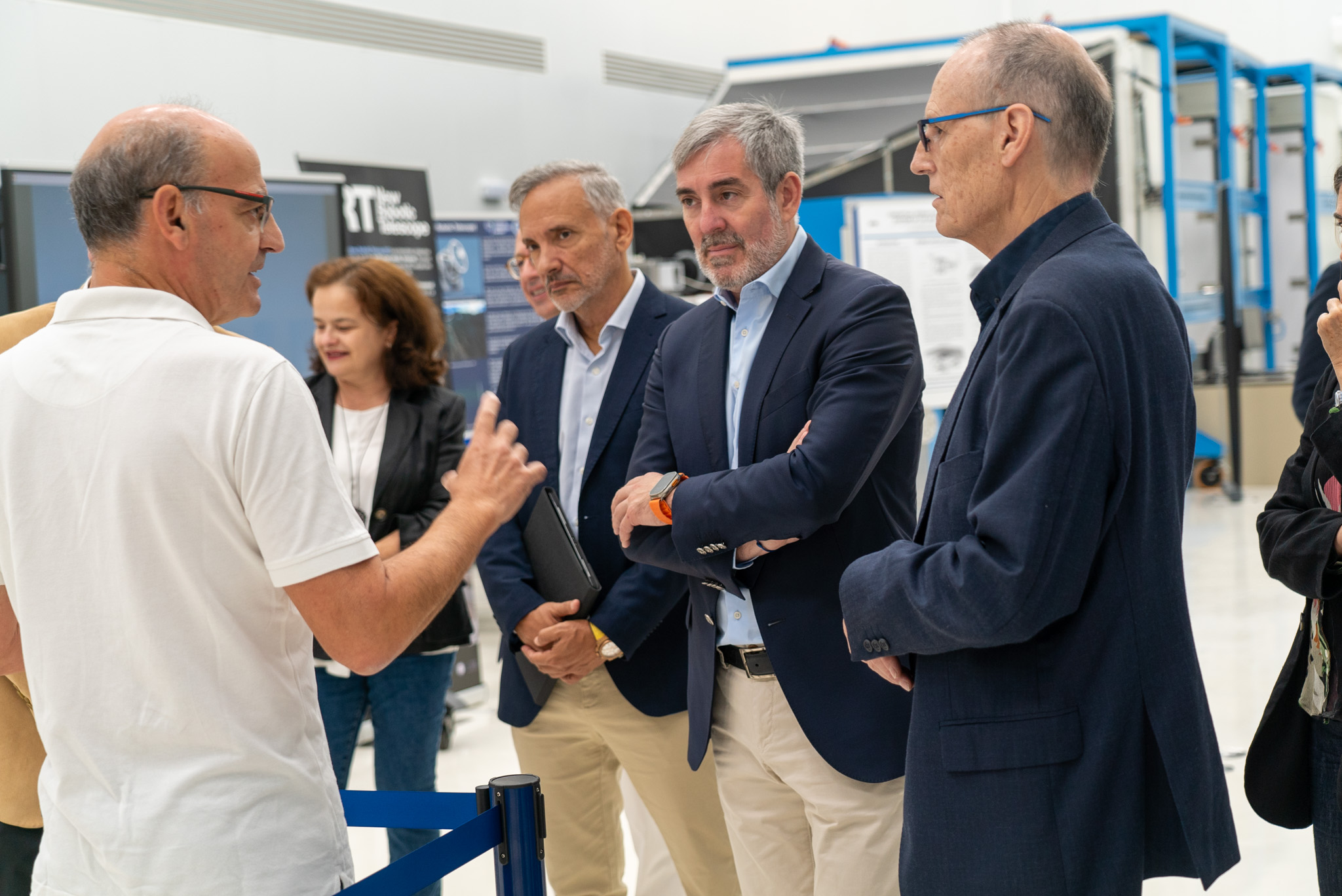 José Luis Rasilla y Carlos Gutiérrez muestran la máquina pulidora para grandes sustratos instalada en IACTEC al Presidente del Gobierno de Canarias, Fernando Clavijo y al director de la Agencia Canaria de Investigación, Innovación y Sociedad de la Información (ACIISI), Javier Franco durante una visita.