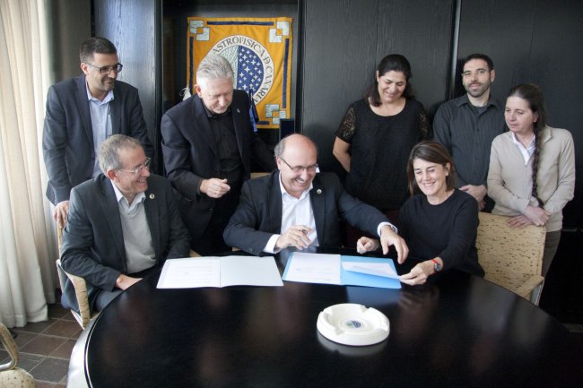 Left to right: Jesús Burgos, head of general administration of the IAC; Carlos Martínez, deputy director; Campbell Warren, executive secretary; Rafael Rebolo, director; Begoña García, head of the instrumentation division; Casiana Muñoz, chair of the SUCOSIP; Enric Pallé, head of the research division; and María Jesús Arévalo, head of the education division, during the sign agreement. Credit: Elena Mora (IAC).