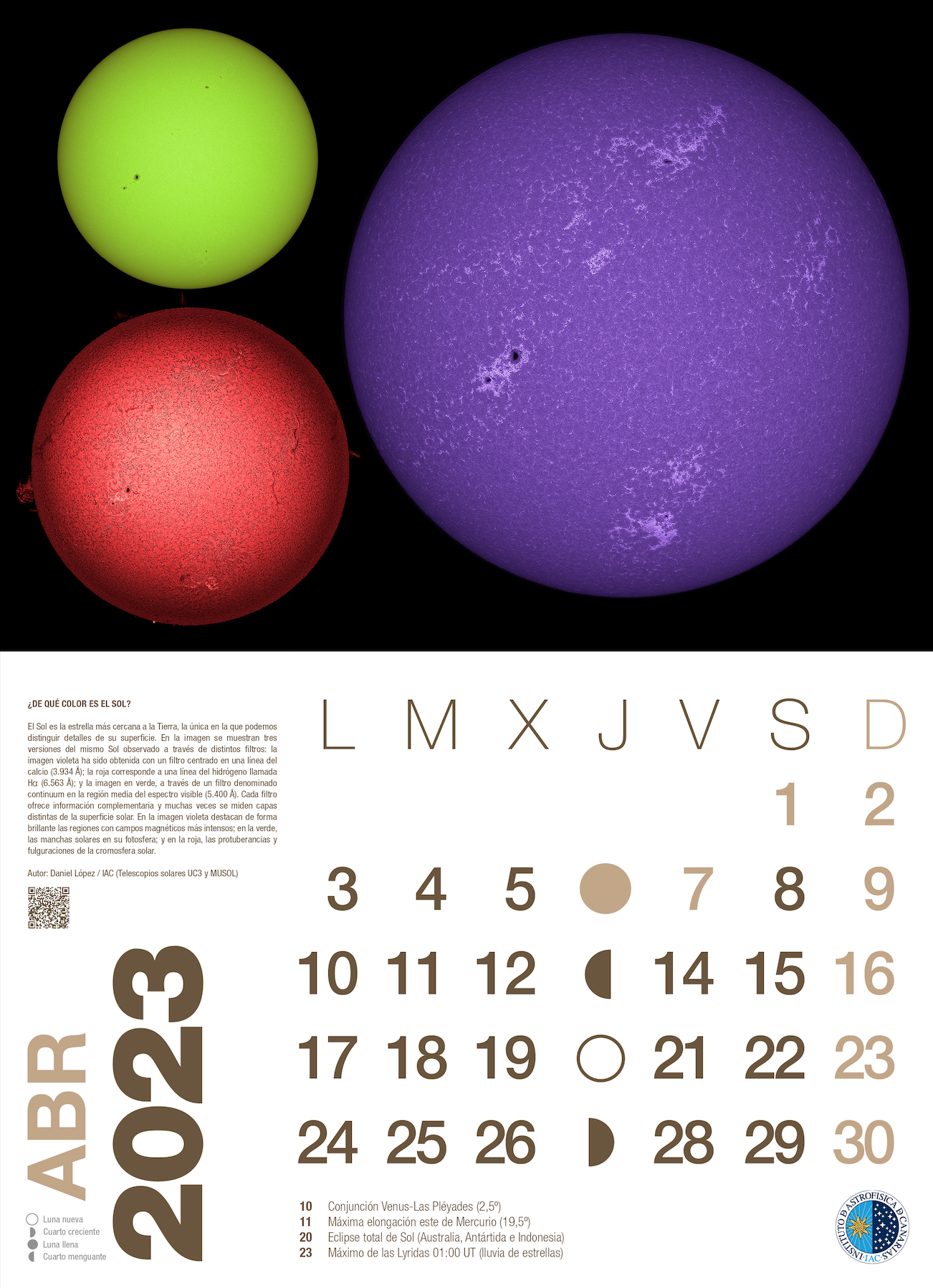 The Sun is the closest star to the Earth, the only one where we can make out details of its surface. The image shows three versions of the same Sun observed through different filters: the violet image is obtained with a filter centred on a calcium line (3 934 Å); the red image corresponds to a hydrogen line called Ha (6 563 Å); and the green image is obtained through a so-called continuum filter in the middle region of the visible spectrum (5400 Å). Each filter provides complementary information and often different layers of the solar surface are measured. In the violet image, the regions with the strongest magnetic fields stand out brightly; in the green image, the sunspots in the photosphere; and in the red image, the bulges and flares in the solar chromosphere.