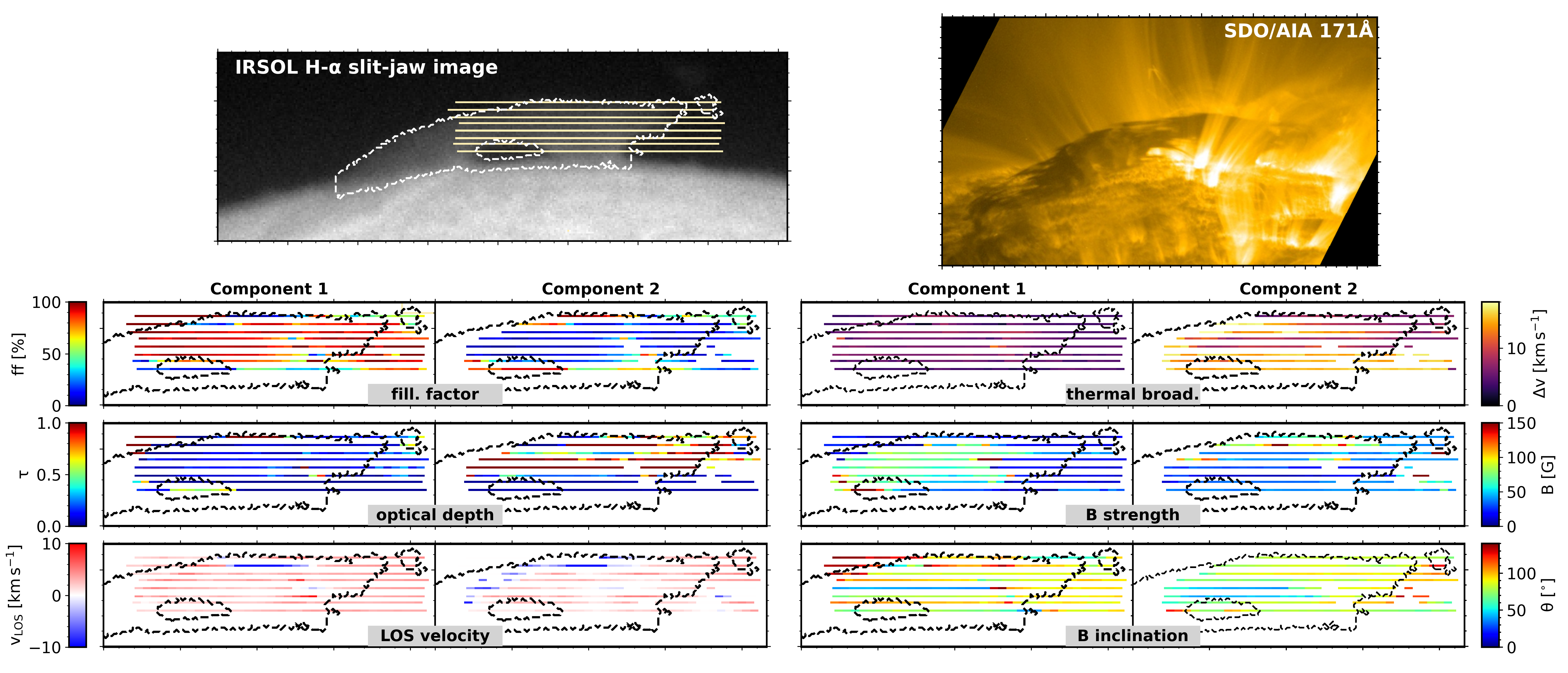 Images of the prominence and parameters inferred for each component at each slit position (in yellow in the upper left panel). The plotted slit width is broader than the one used in the observation. Each major tickmark represents 50''.