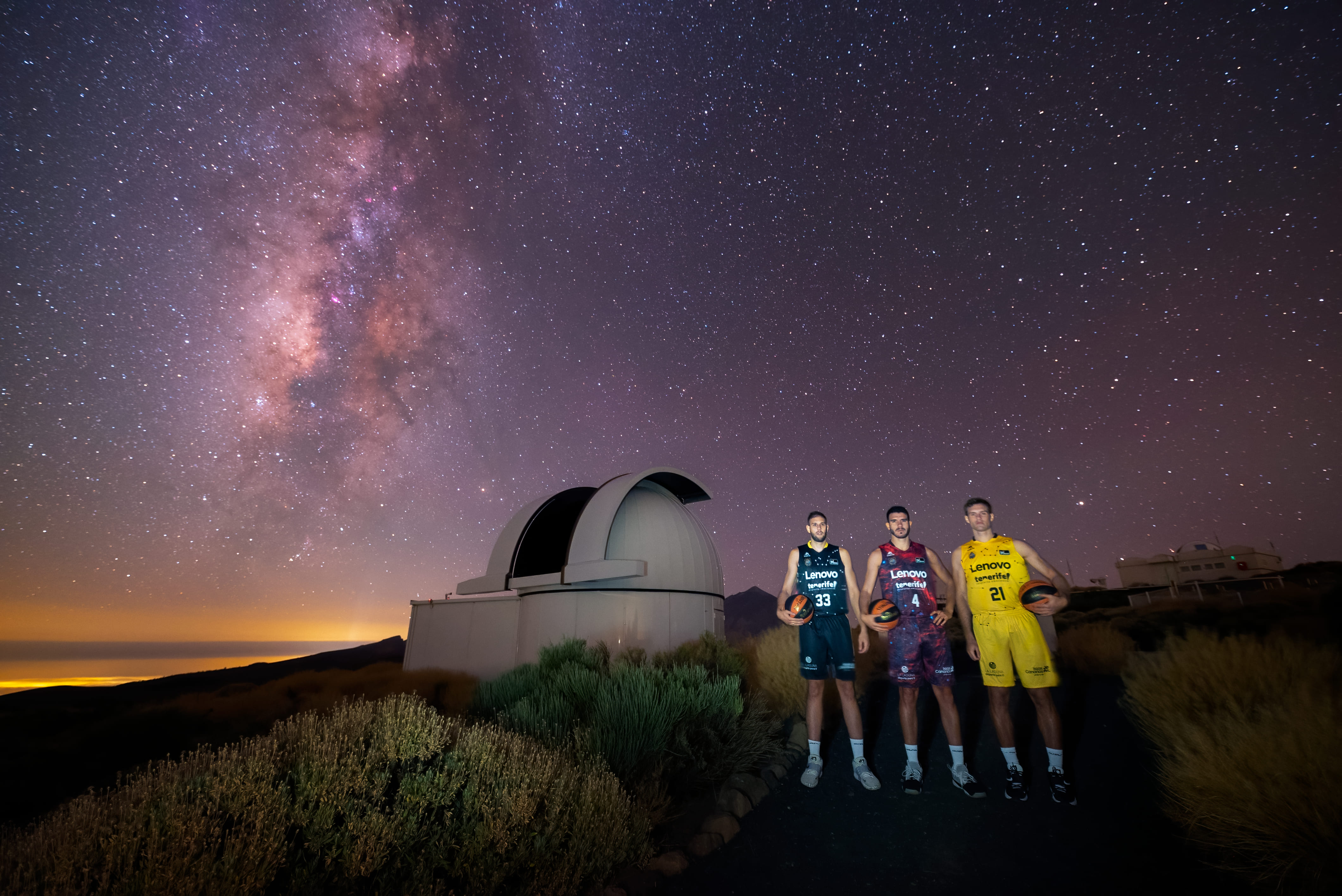 Los jugadores del Lenovo Tenerife Iván Cruz-Uceda , Sergio Rodríguez y Tim Abromaitis con las nuevas equipaciones inspiradas en el cielo de Canarias en el Observatorio del Teide. Créditos: D. López / IAC