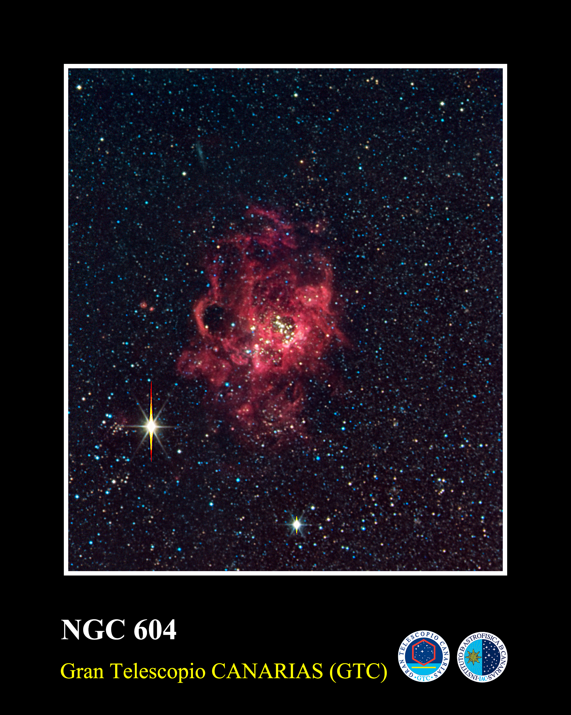 The nebula NGC 604 lies in a spiral arm of the nearby galaxy M33, located about 2.7 million light-years away in the direction of the constellation Triangulum. M33 is a member of the Local Group of galaxies that also includes the Milky Way and the Andromeda Galaxy. NGC 604 was discovered William Herschel in 1784 and can be seen with a small telescope. The nebula is a giant star forming region 1500 light-years across. The gas in NGC 604, around nine tenths of it hydrogen, is gradually collapsing under the force of gravity to create the new stars. Once these stars have formed, the vigorous ultraviolet radiation they emit excites the remaining gas in the cloud, making it glow a distinct shade of red. This colour is typical not only of NGC 604 but of other H II regions too. At the heart of NGC 604 are over 200 hot stars, much more massive than our Sun (15 to 100 solar masses) and their surface temperatures are as hot as 40,000 degrees Celsius. They heat the gaseous walls of the nebula making the gas fluoresce. Their light also highlights the nebula's three-dimensional shape, like a lantern in a cavern. By studying the physical structure of a giant nebula, astronomers may determine how clusters of massive stars affect the evolution of the interstellar medium of the galaxy. The nebula also yields clues to its star formation history and will improve understanding of the "starburst" process when a galaxy undergoes a "firestorm" of star formation. The bright stars in NGC 604 are extremely young by astronomical standards, having formed a mere 3 million years ago.