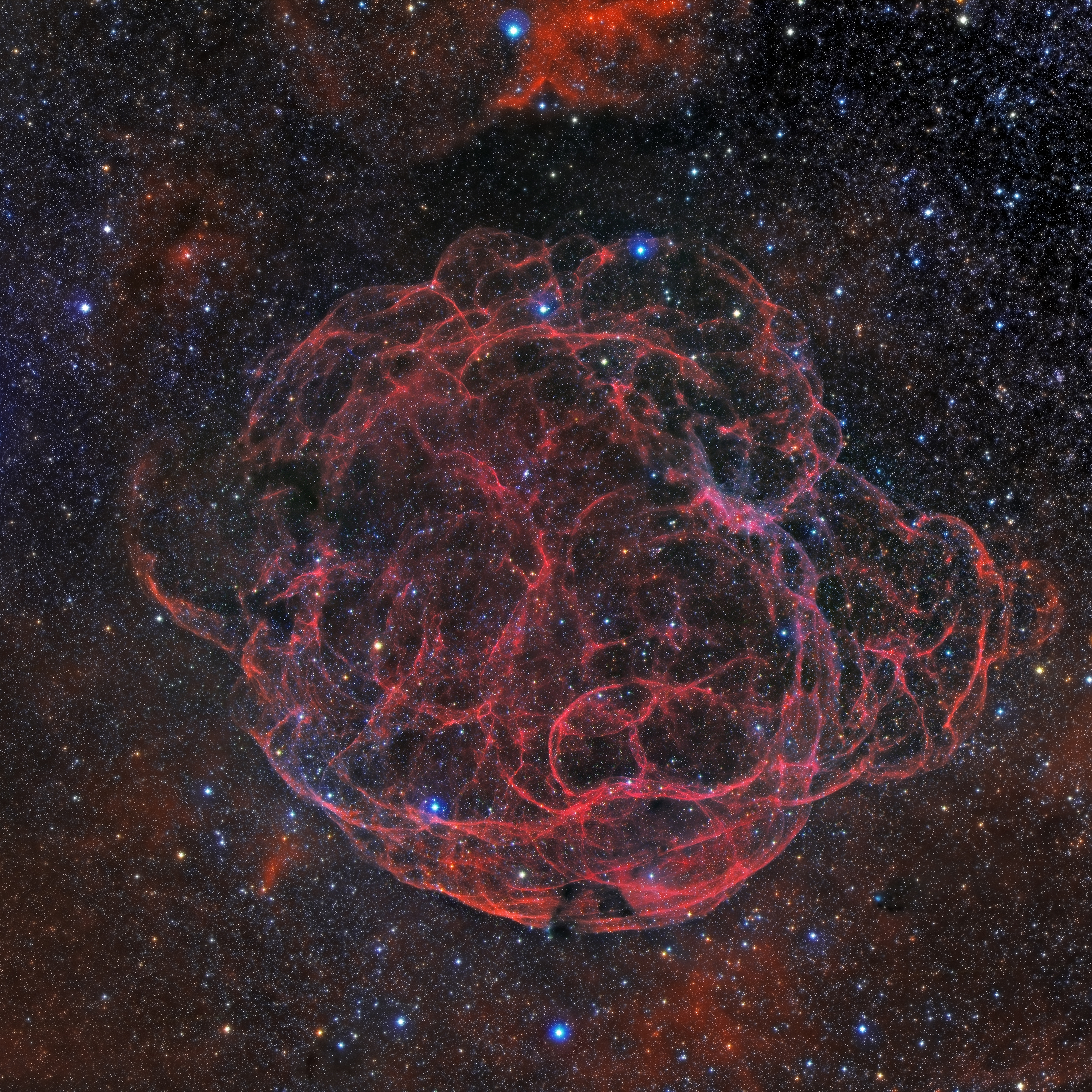 The remnant of supernova Simeis 147 (SNR G180.0-01.7) shows an apparent size in the sky that is truly spectacular. If it were possible to observe it with the naked eye, it would reach more than four degrees in its maximum extension, equivalent to eight Moons aligned from side to side. It is estimated that this object is about 3,000 a.l. from us, which would imply that it covers an approximately spherical volume of between 150 and 200 a.l. in diameter. If we consider that the nearest star, Proxima Centauri, is 4.2 light-years away, it is possible to imagine the colossal real dimensions of this astronomical object. This nebula expands at a speed of about 100 km/s and seems to have enough energy to still emit radiation, even at gamma rays, as confirmed by the Fermi space telescope.
