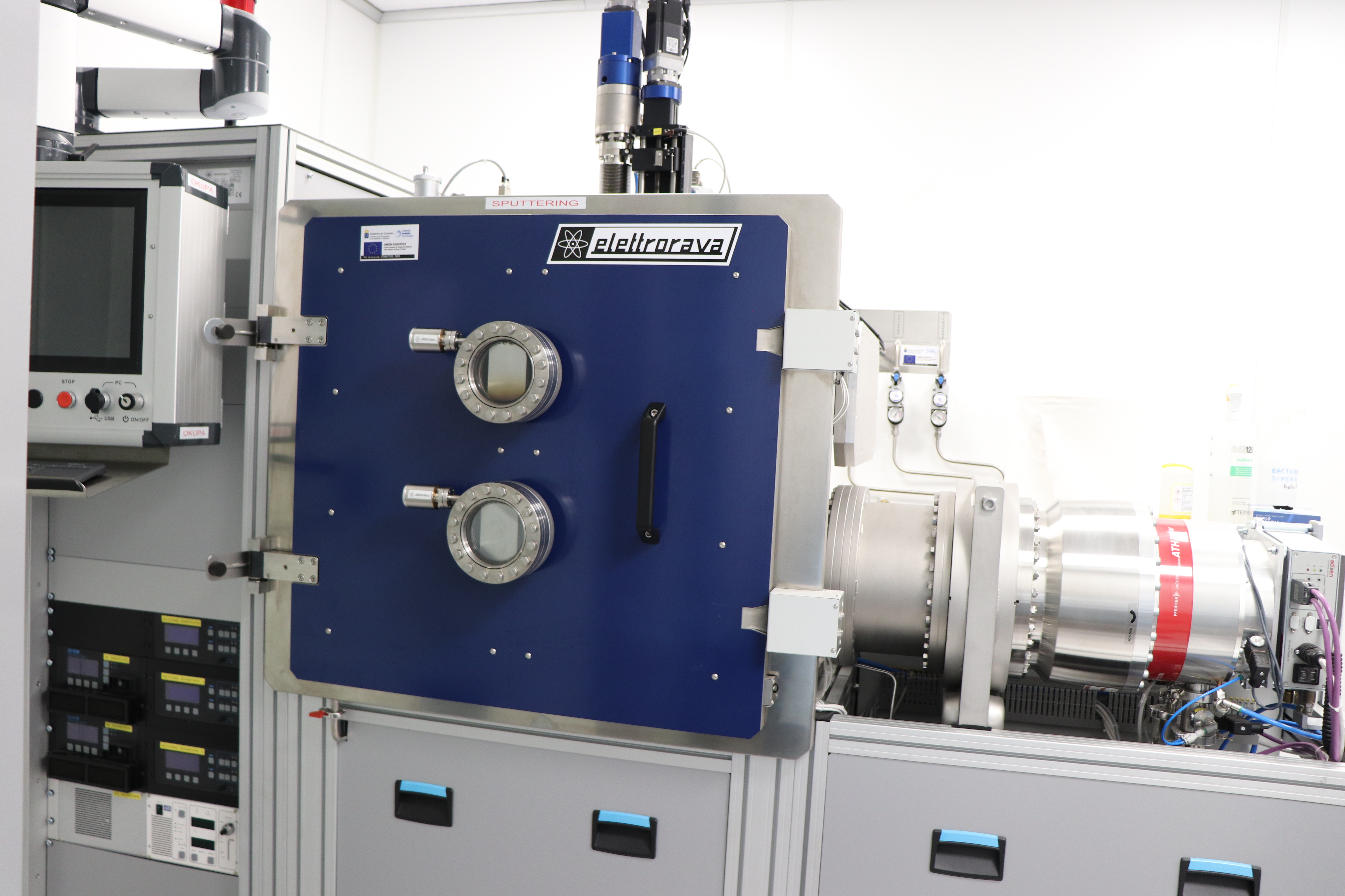 Este sistema de recubrimiento se encuentra en en el laboratorio de películas delgadas. Se trata de una cámara de vacío que permite hacer recubrimientos de películas delgadas en sustratos de hasta 0,5 m de diámetro. Para el recubrimiento utiliza una técnica basada en un campo magnético que permite bombardear un blanco y conseguir así la vaporización a baja temperatura y consiguiente deposición de los átomos sobre el sustrato. Esta técnica se conoce como sputtering magnético. El sistema de sputtering está formado por cuatro magnetrones de pulverización de 6 pulgadas.