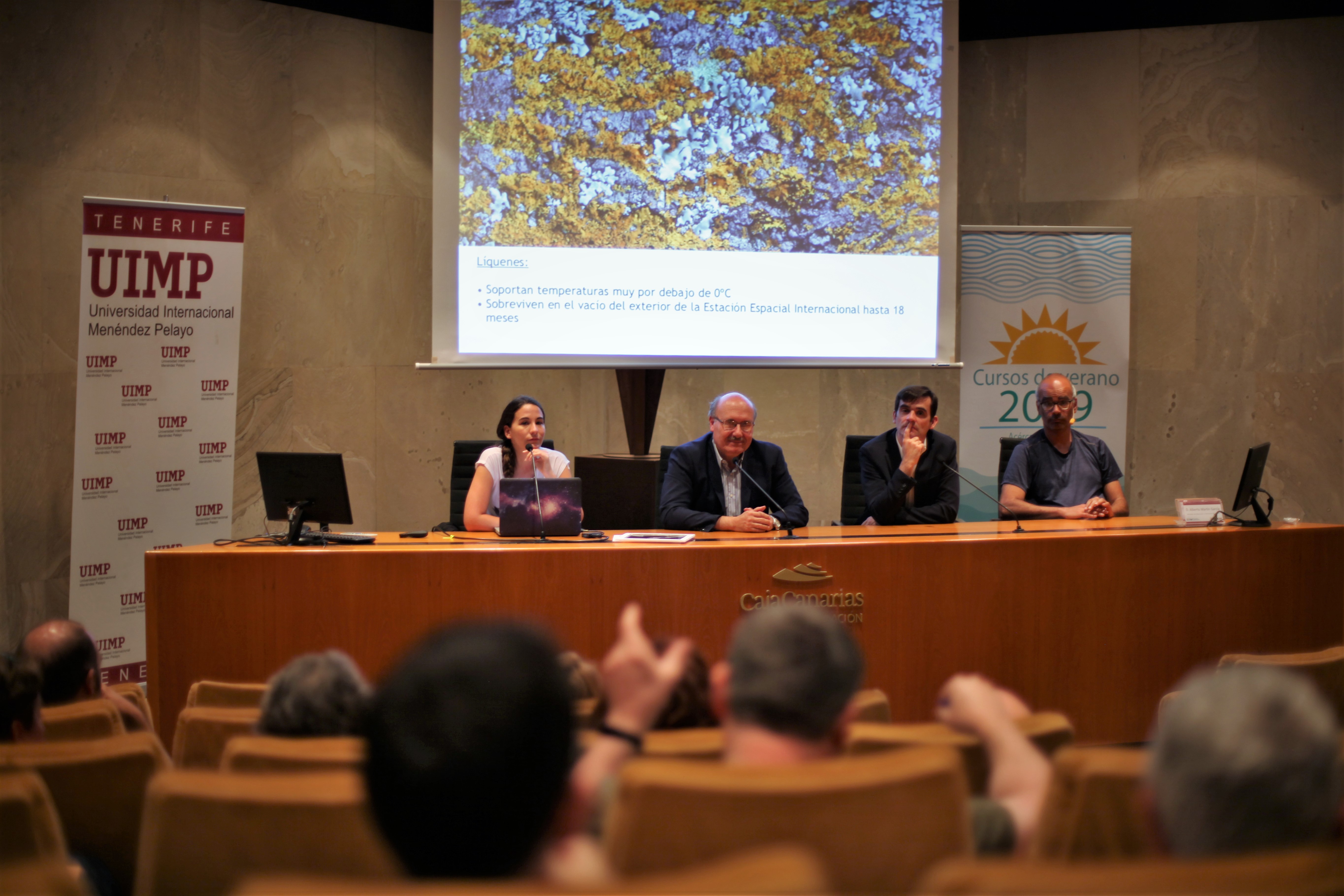 Moment of the round table of the summer course "Acercate al Cosmos" of the Menéndez Pelayo International University (UIMP). From left to right: Patricia Chinchilla, Rafael Rebolo, José Alberto Rubiño and Antonio Eff-Darwich. Credit: Alejandra Rueda (IAC)