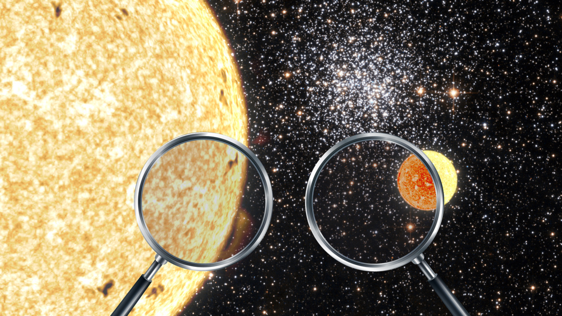The figure shows a cluster of stars like the ones analysed in this work. The emitted light loses energy as it escapes the gravitational field of each star. This energy loss manifests itself as a reddening that is larger for main-sequence stars with relatively small radii (right) than for giant-phase stars with larger radii (left). Credit: Gabriel Pérez Díaz (IAC). Background image: ESA/Hubble and NASA. Magnifiers based in an illustration by freepic.es.