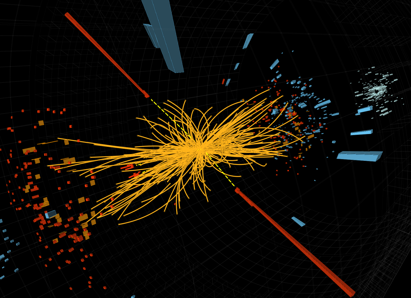 Particle physics experiment at CERN (European Organisation for Nuclear Research): proton collision measured by the CMS (Compact Muon Solenoid) experiment, candidate for the production of 1 Higgs. Credit: CERN, CMS Collaboration.