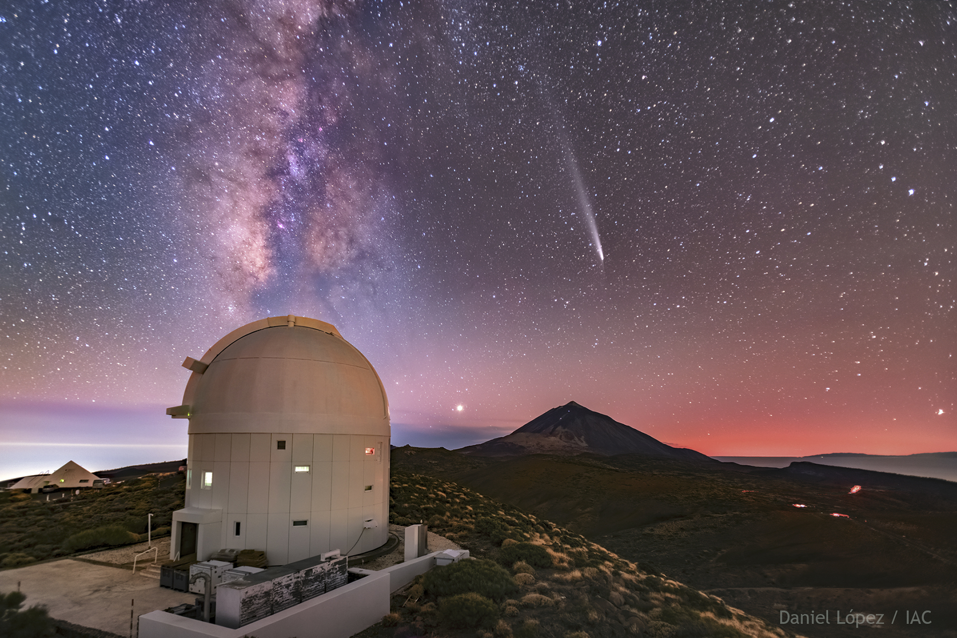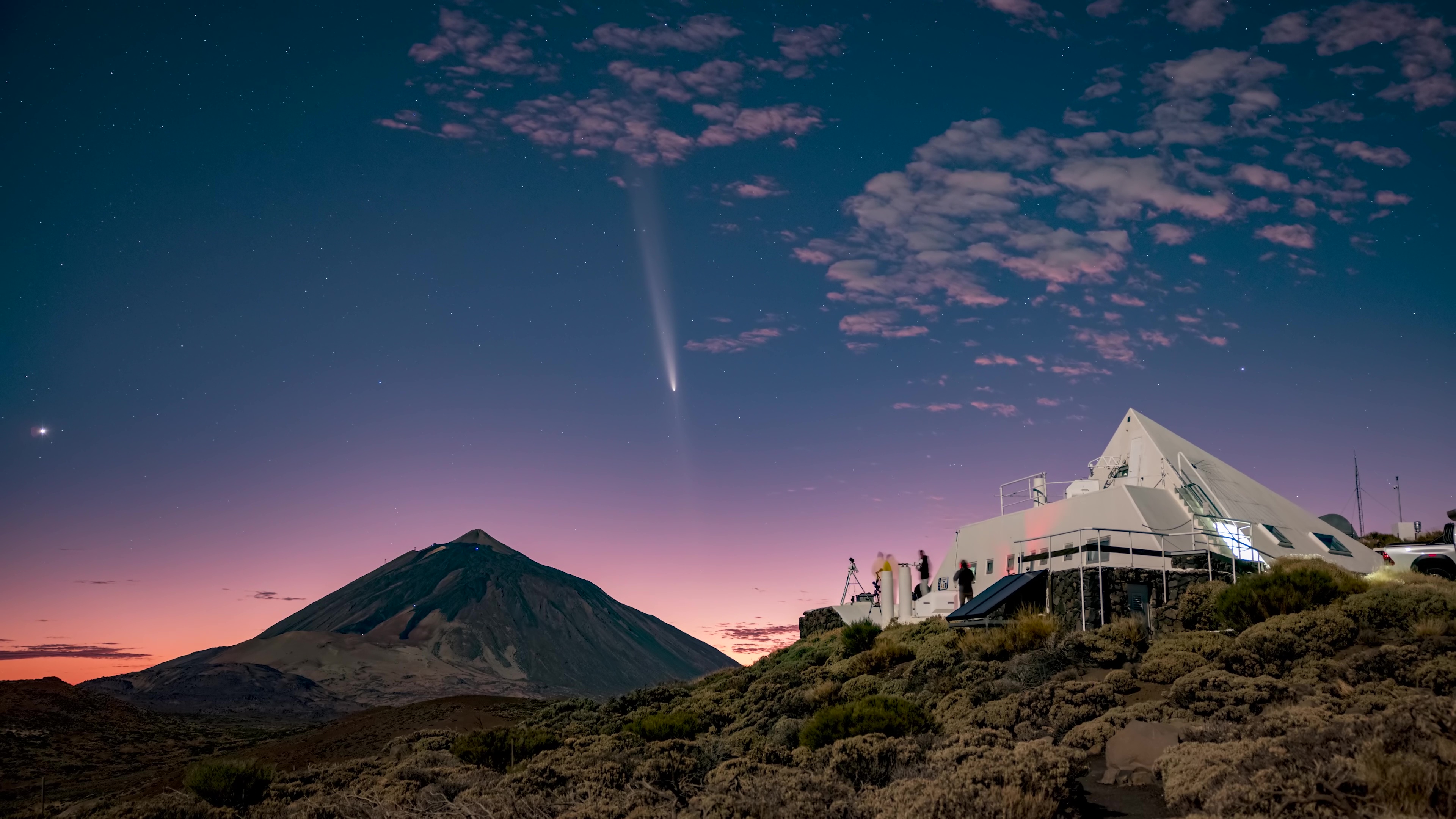 El 15 de octubre, a pesar de una Luna iluminada al 96 %, la suma de condiciones, en general, enumeradas en la segunda entrada en el blog sobre este cometa, hacían esperar buenas condiciones para su observación. Con este objetivo convocamos a un grupo de activos profesores del proyecto CosmoLab del IAC en el Observatorio del Teide, con el fin de poder disfrutar del evento. Aunque las nubes hicieron acto de presencia, no impidieron observar y disfrutar del efímero visitante.