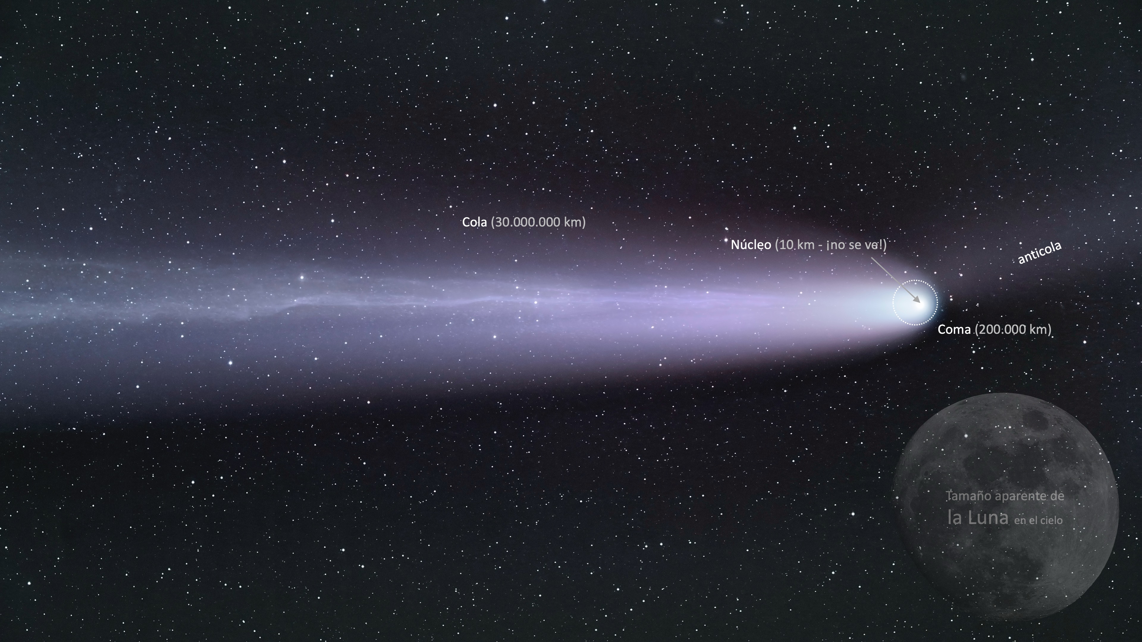 Esa madrugada el cometa estaba situado a unos 113 millones de kilómetros. Con una cola de aproximadamente 14 grados, pudimos estimar su longitud proyectada en alrededor de 28 millones de kilómetros de longitud, seguramente más de 30 millones reales. Eso es más de 2.300 veces el diámetro terrestre, o una distancia que bien merece ser medida en segundos-luz: ¡100 segundos-luz! Un tamaño realmente espectacular si pensamos que son los restos de un bloque de hielo de tan solo una decena de kilómetros de diámetro aproximadamente.