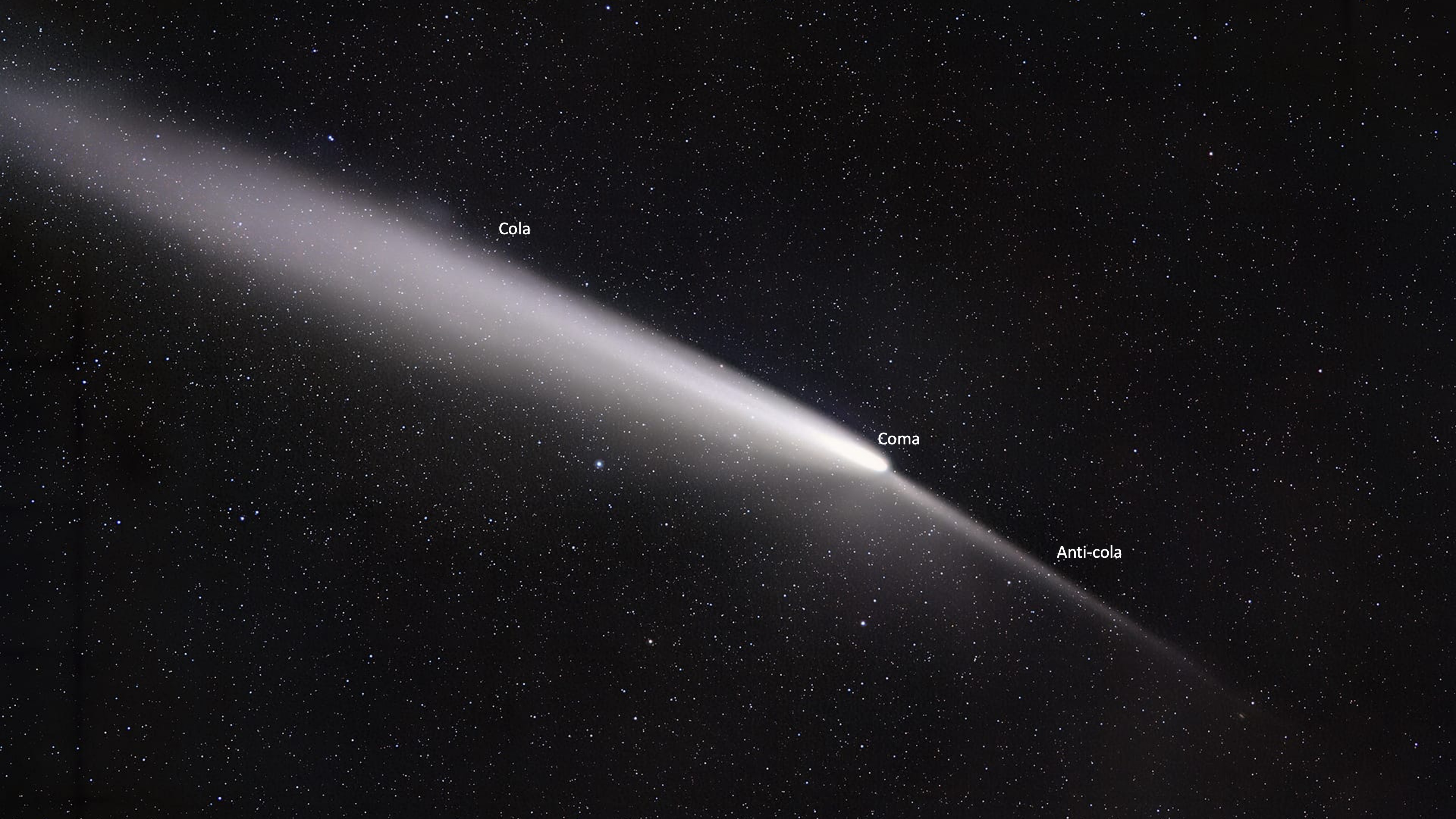 La anticola es parte de la cola de polvo del cometa que parece apuntar hacia el Sol. Se trata de una ilusión óptica que se acentúa cuando la Tierra cruza el plano de la órbita del cometa, especialmente cuando éste está cerca del Sol, como es el caso del C/2023 A3. El polvo del cometa, especialmente el material más pesado, va quedando en una delgada lámina que es soplado lentamente por el viento solar, quedando por detrás del cometa, dando lugar así a esta denominada anticola. La anticola del cometa C/2023 A3 resultó extremadamente bien definida, seguramente un rasgo diferenciador de este cometa que permanecerá en nuestra memoria.