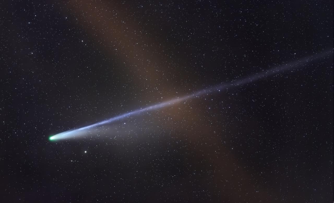 Foto 17: Cometa C/2025 A6 (Lemmon) observado el 22 de octubre de 2025 desde el Observatorio del Teide con una Canon 6DII y un objetivo de 135mm f1.8 con seguimiento estelar. Se trata de 40 imágenes individuales de 15 s de exposición (10 minutos en total) a ISO 1600. La banda tenue de color marrón en diagonal es un cirro que se desplaza entre las exposiciones. Daniel López y Alfred Rosenberg / IAC.