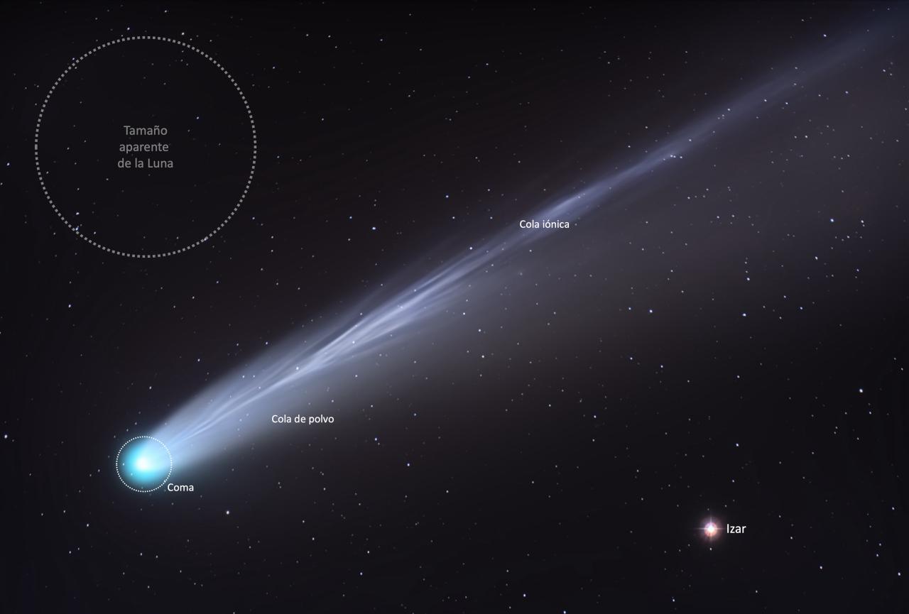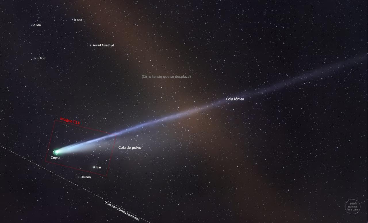 Foto 29: Se señalan la posición del núcleo, la coma y la cola, así como el tamaño aparente de la Luna como referencia de tamaño del campo cubierto. Daniel López y Alfred Rosenberg/ IAC.