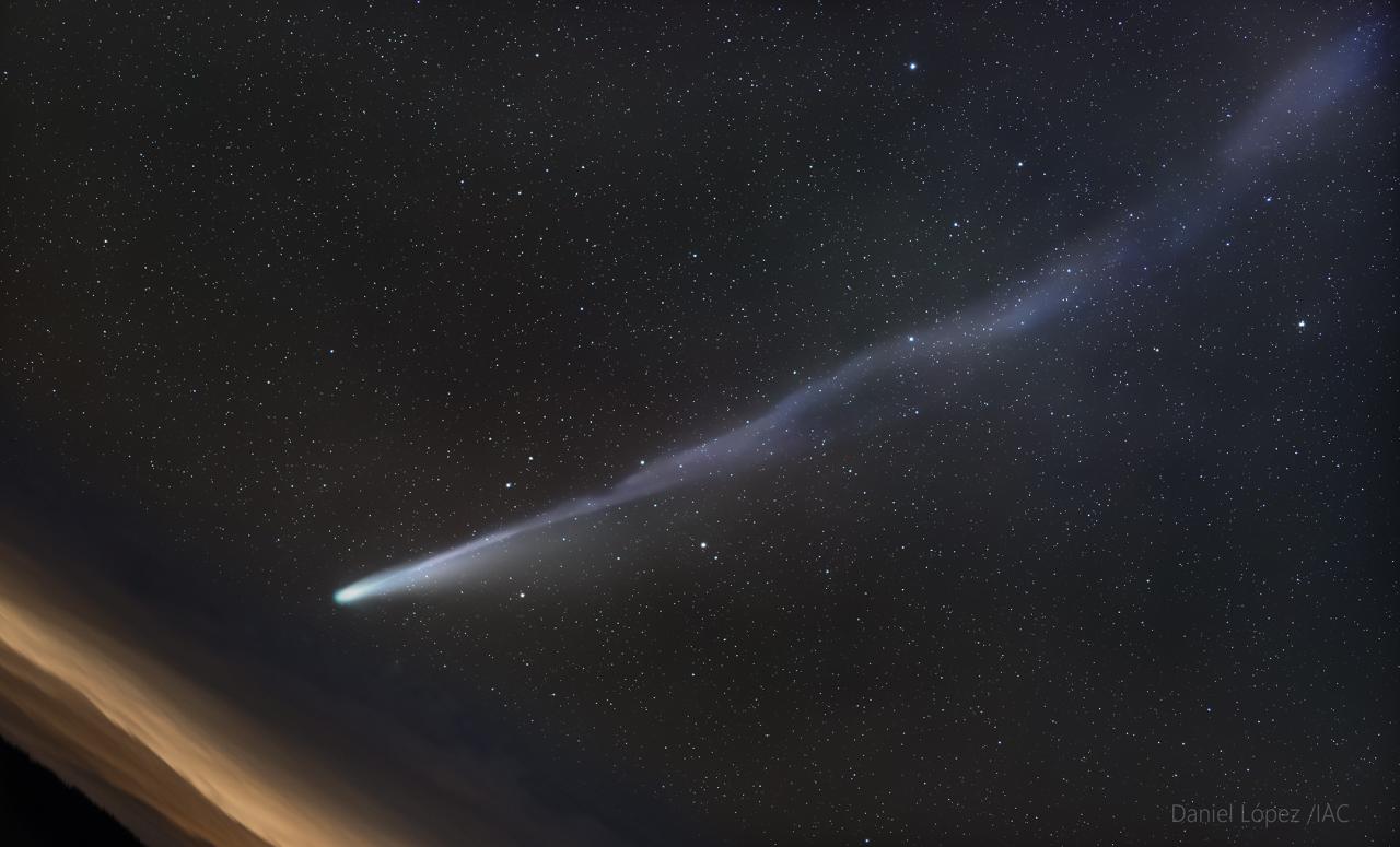 Foto 19: Cometa C/2025 A6 (Lemmon) observado el 23 de octubre de 2025 desde el Observatorio del Teide con una cámara réflex digital fullframe y un objetivo de 135mm f1.8 con seguimiento estelar. La imagen es combinación de 60 imágenes individuales de 15 s a 1600 ISO, haciendo un tiempo de exposición total de 15 minutos. Sin duda una de las imágenes más espectaculares del cometa, con una extensa cola iónica de más de 13 grados en la imagen (prosigue fuera de la misma) que se muestra de forma curvilínea y bastante heterogénea. La cola de polvo también es extensa, aunque no tanto. Daniel López y Alfred Rosenberg/ IAC.