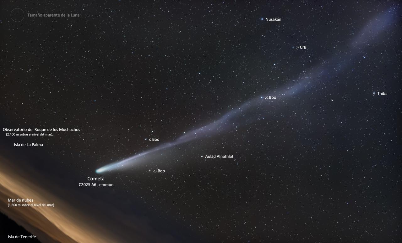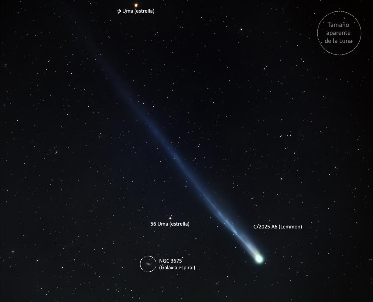 El cometa C/2025 A6 (Lemmon) fue el primero de los dos en ser descubierto (3 de enero de 2025) por Carson Fuls desde Mt. Lemmon (Arizona, EE.UU.) Se trata de un cometa de largo periodo. Se estima que ha tardado más de 700 años desde su posición más lejana en su órbita, allá en la fría nube de Oort, a más de 240 UA (unas 8 veces más distante que Neptuno del Sol) y su paso actual probablemente modifique su órbita acortando este periodo en unas decenas de años. Su tamaño es moderado, estimado entre uno y dos kilómetros de diámetro. Alcanzó el perihelio el 8 de noviembre de 2025 a 0.53 UA del Sol (más cerca que Venus, pero no tanto como Mercurio). Pueden obtener todo tipo de datos, imágenes y gráficos en las páginas de cometografía.es, The Sky Live, Comet Observation Database (COBS) o en la Small-Body Database de la NASA, entre muchas otras.