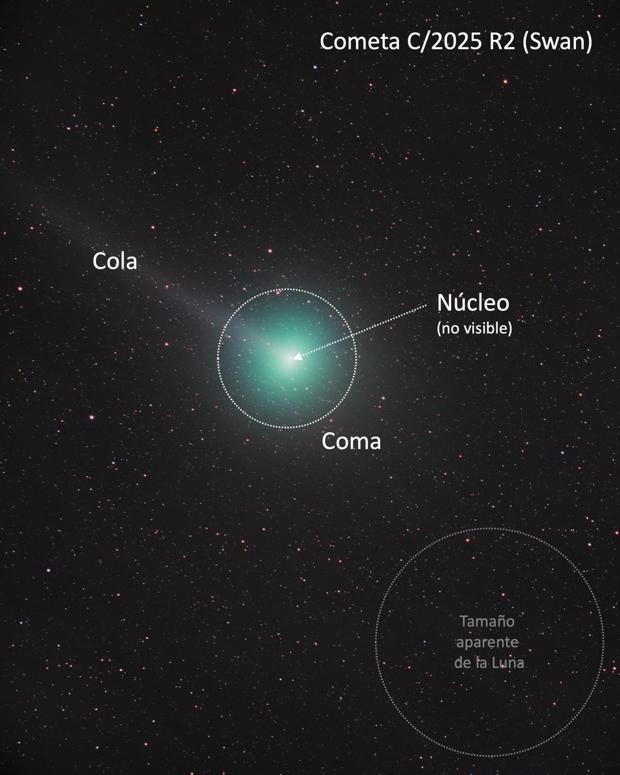 Por su parte, el cometa C/2025 R2 (Swan) es más pequeño (se estima que es una bola de hielo de aproximadamente medio kilómetro de diámetro) con una órbita que también alcanza la Nube de Oort (llega a unas 170 UA, más de 5.5 veces la distancia de Neptuno al Sol) y su periodo estimado es de unos 800 años, por lo que la última vez que pasó cerca de nosotros fue en el siglo XIII. Fue descubierto el 10 de septiembre de 2025 por V. Bezugly en imágenes de la cámara SWAN a bordo del telescopio solar espacial SOHO. Alcanzó el perihelio el 12 de septiembre de 2025 a 0.50 UA del Sol. Pueden encontrar más información actualizada en los siguientes enlaces: cometografía.es, The Sky Live, Comet Observation Database (COBS) o en la Small-Body Database.