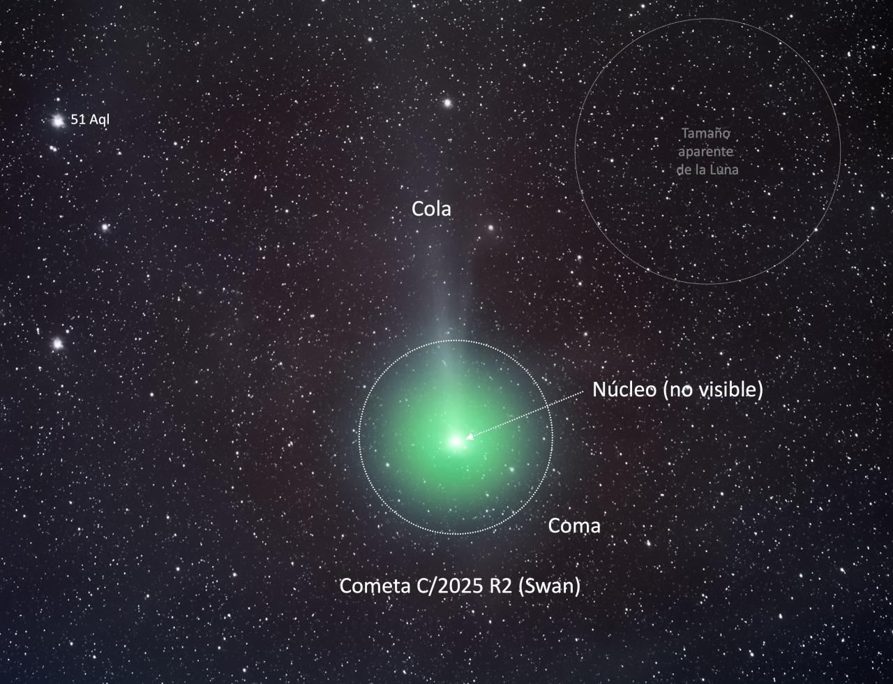 Foto 31: Imagen del cometa C/2025 R2 (Swan) tomada la noche del 22 de octubre con un telescopio de 14” a f2.0 y una cámara Cannon Ra. Se señala la estrella 51 Aql como referencia de su posición y el tamaño aparente de la Luna para dar una aproximación del campo mostrado. Destaca la extensa coma que presenta. Daniel López y Alfred Rosenberg/ IAC.
