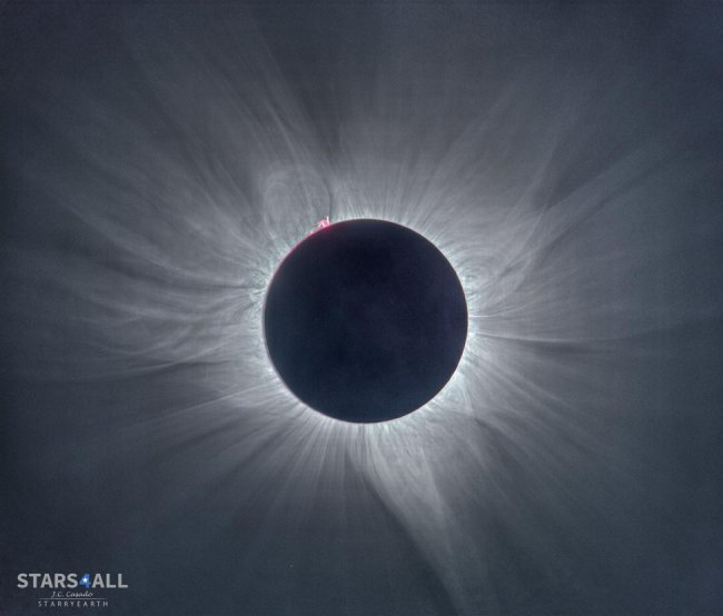Imagen del Sol tomada desde Palu, Indonesia, el 9 de marzo de 2016. La corona es simétrica debido a que el Sol estaba en un periodo de gran actividad. También pueden observarse las “llamaradas” de la cromosfera. Crédito: J. C. Casado.