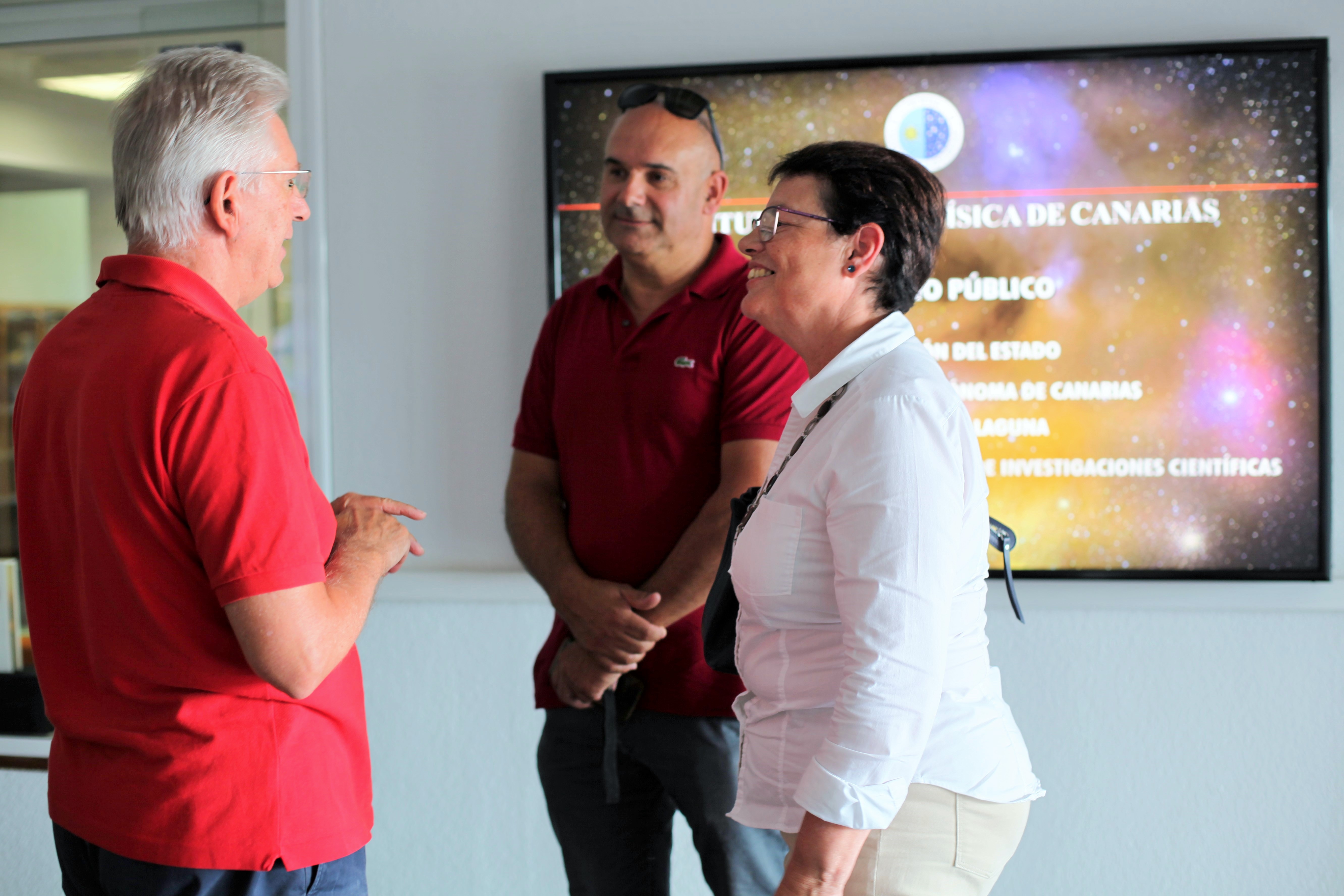 Ana Rosa Mena, alcaldesa de Tegueste, con Campbell Warden, secretario ejecutivo del IAC en el vestíbulo de la sede central del IAC en La Laguna. Crédito: Alejandra Rueda (IAC)