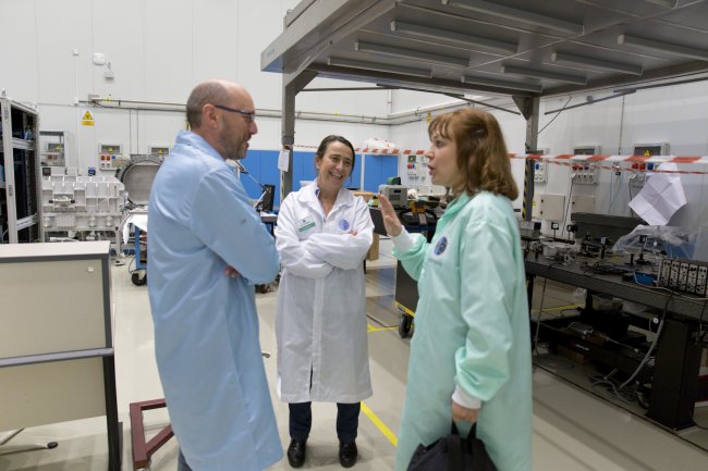 La escritora Ángela Vallvey en el Área de Instrumentación con los ingenieros Enrique Joven y Francisca Gómez Reñasco. Crédito: Elena Mora (IAC).