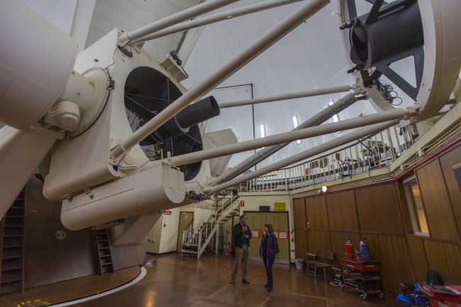 La escritora Ángela Vallvey con Marc Balcells, director del Grupo de Telescopios Isaac Newton (ING), en el Observatorio del Roque de los Muchachos (Garafía, La Palma). Crédito: Antonio González/IAC.