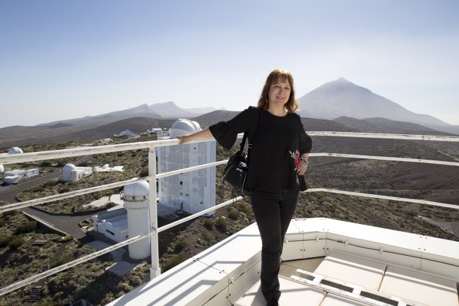 La escritora Ángela Vallvey, en la torre solar alemana (VTT), del Observatorio del Teide (Izaña, Tenerife). Crédito: Elena Mora (IAC).