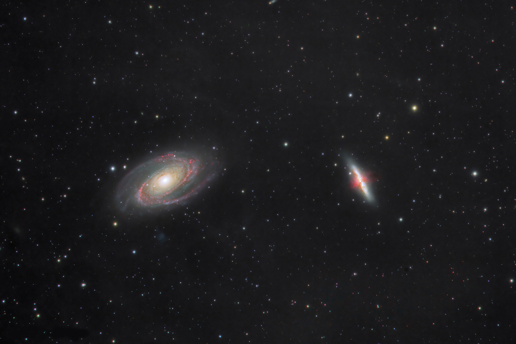 La Imagen Astronómica de este mes muestra a dos inmensas galaxias localizadas en la constelación de la Osa Mayor, M81 (galaxia de Bode) con una forma espiral muy pronunciada y M82 (galaxia del Cigarro) de forma irregular.