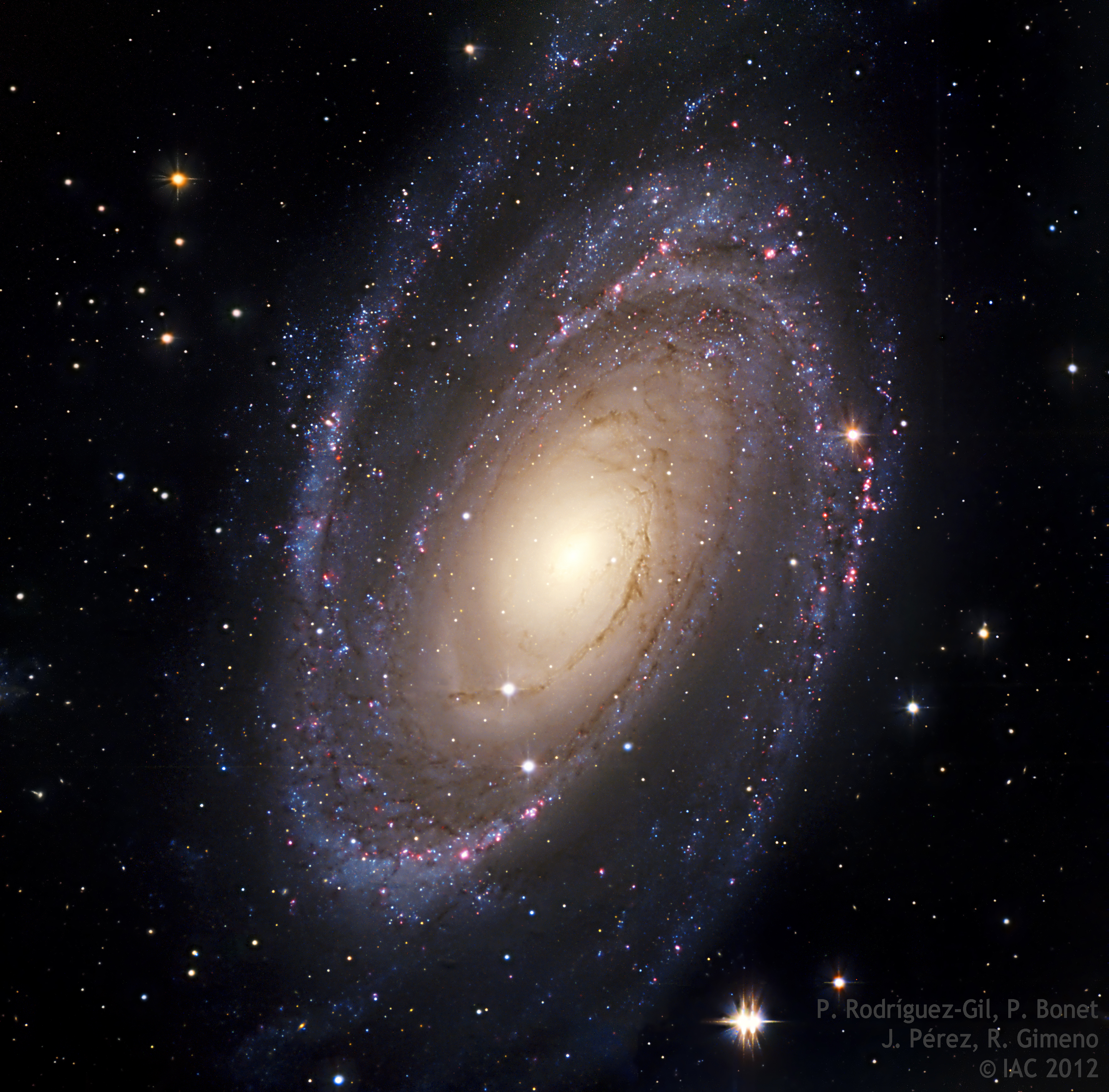 Una de las más espectaculares parejas de galaxias observables en el cielo es la formada por M81 y M82, en la Osa Mayor. Un pequeño telescopio o incluso un buen par de prismáticos es suficiente para observar este par de galaxias, separadas solo 38 minutos de arco y descubiertas por el astrónomo alemán Johann E. Bode en diciembre de 1774 desde Berlín. La galaxia principal, la majestuosa M81, es una espiral tipo Sab de magnitud 7 cuyo brazos rebosan de estrellas gigantes azules y poseen enormes regiones con brotes de formación estelar que destacan con su color rojo propio del hidrógeno atómico. M81 alberga un núcleo activo con características del tipo de las galaxias Seyfert y con emisiones variables en rayos X y en radio, sospechándose que alberga un agujero negro en su interior. Gracias a su cercanía, de unos 12 millones de años luz, es una de las galaxias de estas características mejor estudiadas.