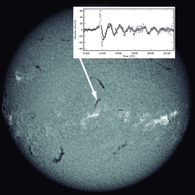 Imagen del Sol tomada por los telescopios de la red GONG en un filtro Hα. Las protuberancias se ven como filamentos oscuros sobre el disco solar. La flecha indica una protuberancia que oscila. En el diagrama se muestra la velocidad horizontal de la prominencia. En la fase inicial alcanza los 60 km/s. El movimiento periódico persiste durante varias horas. Crédito: Manuel Luna (IAC).