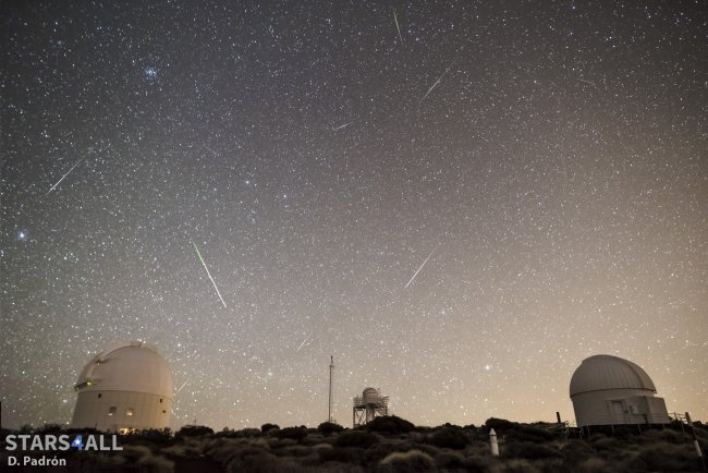Meteoros registrados en el Observatorio del Teide (IAC) entre las 06:13h y las 06:38h UT (hora local canaria) del día 4 de enero de 2107. La estrella más brillante a la izquierda es Procyon (Canis Minor), Castor y Pollux (Géminis) casi en el centro. El cúmulo que se observa en la parte superior es el del Pesebre (Beehive Cluster) en la constelación de Cáncer. La mayor parte de loa meteoros registrados son Cuadrántidas.