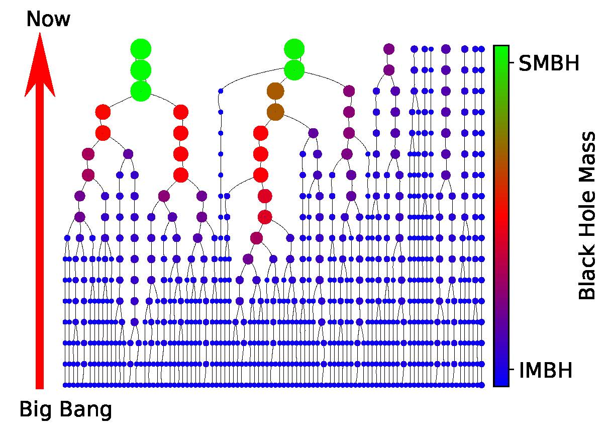 Esquema de cómo crece la masa de los agujeros negros desde el origen del universo (Big Bang) hasta nuestros bias (Now). Conforme se fusionan entre ello, los agujeros negros crecen en masa hasta llegar a ser agujeros negros supermasivos. Este proceso es muy ineficiente, así que todavía sobreviven en nuestro entorno algunos de los agujeros negros de masa intermedia que ya existían en el Big Bang. Crédito: Jorge Sánchez Almeida (IAC)