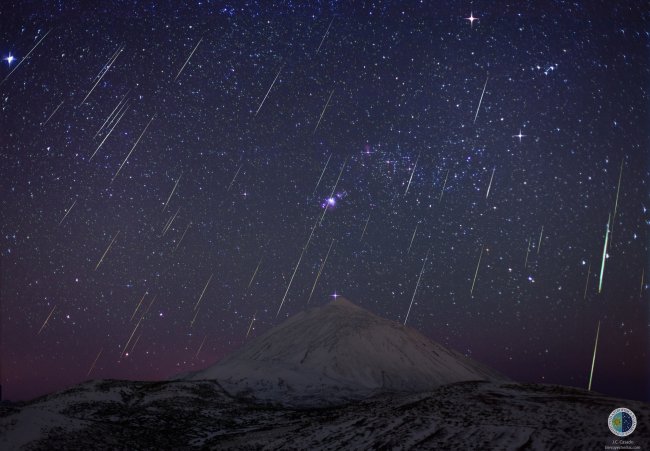 Imagen de la lluvia de estrellas fugaces Gemínidas sobre el volcán Teide (Tenerife, Islas Canarias) en diciembre de 2013. Crédito: J.C. Casado.