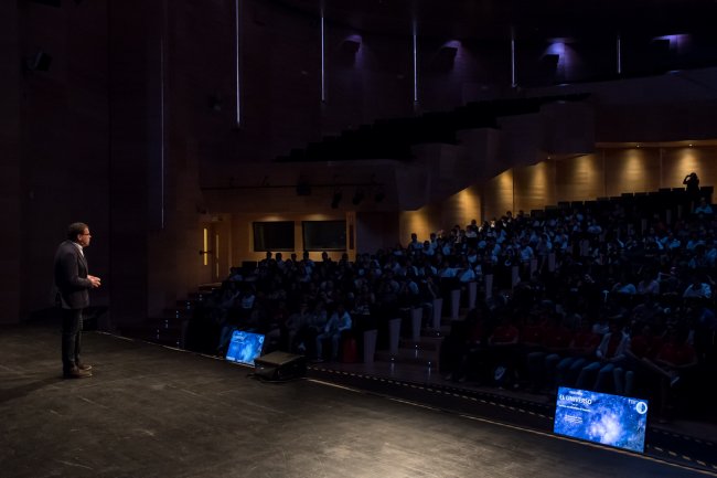 Imagen cedida por ACIISI. Manuel Miranda, director de la Agencia Canaria de Investigación, Innovación y Sociedad de la Información (ACIISI), durante su intervención en la charla "Descubre el Universo" celebrada en el Palacio de Formación y Congresos de Puerto del Rosario (Fuerteventura). Crédito: Rafa Avero.