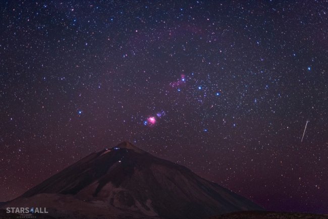 Gemínida a la derecha del pico del volcán Teide con la nebulosa de Orión. Las luces cerca del pico son alpinistas subiendo al volcán. La imagen se obtuvo la madrugada del 10 de diciembre de 2016 desde el Observatorio del Teide, Instituto de Astrofísica de Canarias. Crédito: J.C. Casado (IAC).