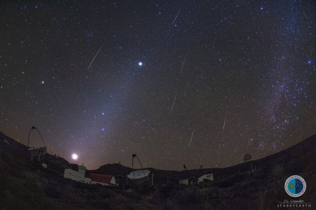 Meteoros gemínidas sobre los telescopios MAGIC (ORM, IAC) el 13 de diciembre de 2015. También son visibles los planetas Venus, Marte y Júpiter y la luz zodiacal. Crédito: J.C. Casado, IAC.