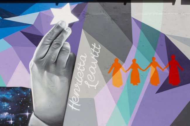 Detalle del mural en homenaje a Henrietta Leavitt en el que aparece su firma y la silueta de cuatro de las Computadoras de Harvard. Crédito: Elena Mora (IAC).