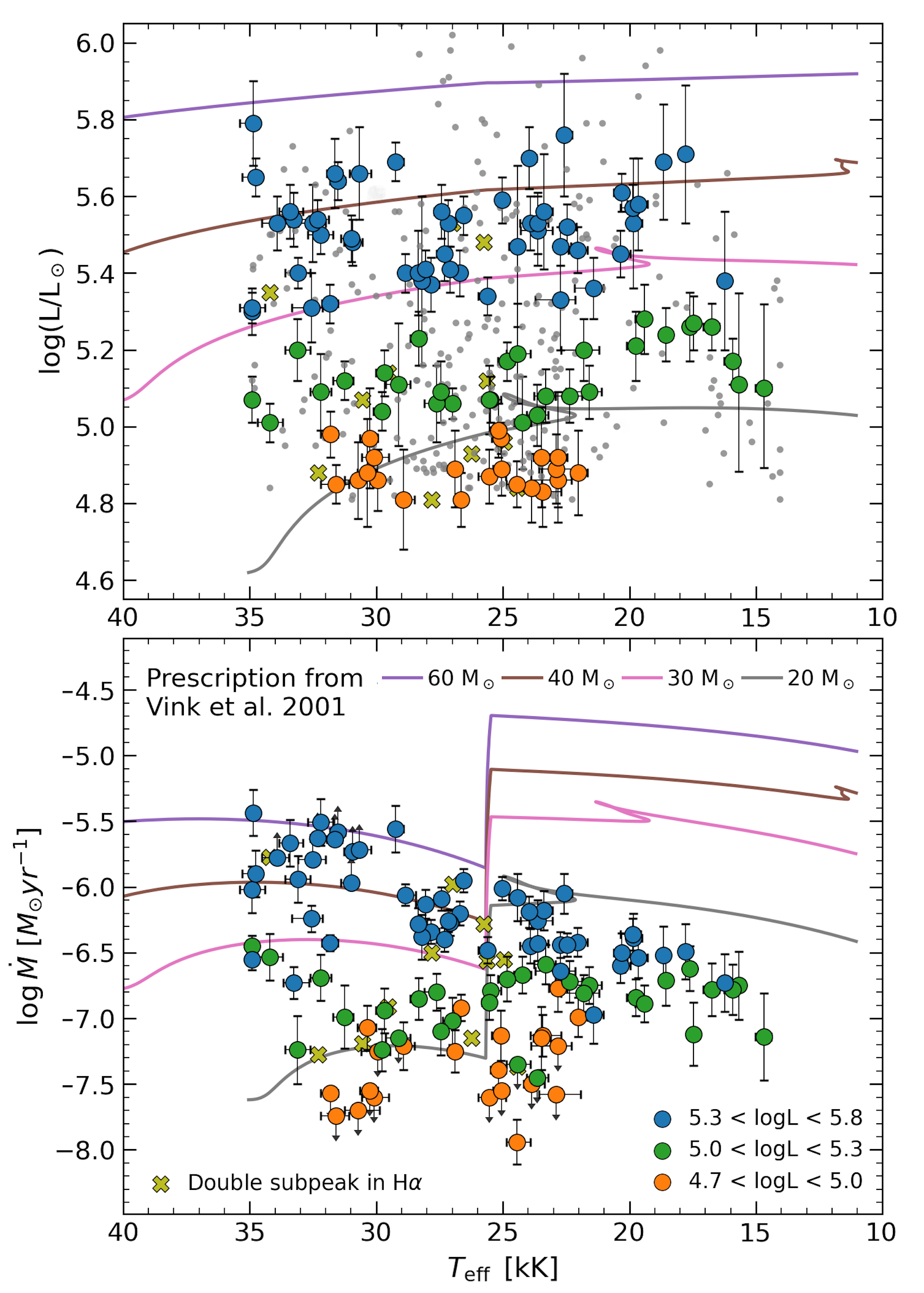 Propiedades de las 116 supergigantes azules galácticas. Panel superior: ubicación de las estrellas en el diagrama de Hertzsprung-Russel de luminosidad frente a temperatura efectiva. Panel inferior: pérdidas de masa en función de la temperatura efectiva.