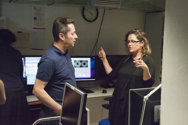 Ignacio Cirac con la astrofísica Nazaret Bello, en la torre solar alemana VTT, en el Observatorio del Teide (Izaña, Tenerife). Crédito: Miguel Briganty, SMM (IAC).