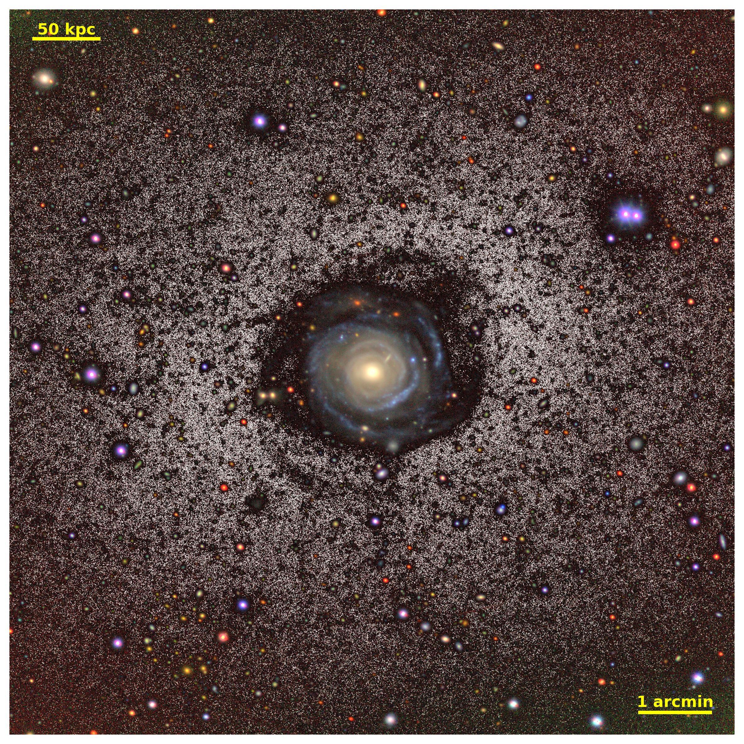 Imagen profunda en luz visible de la galaxia gigante de bajo brillo superficial Malin 2, obtenida con el Two-meter Twin Telescope (TTT) en el Observatorio del Teide. La imagen revela estructuras estelares tenues y características difusas alrededor de la galaxia que no se habían visto anteriormente. Crédito: Junais et al. 2025 / TTT.