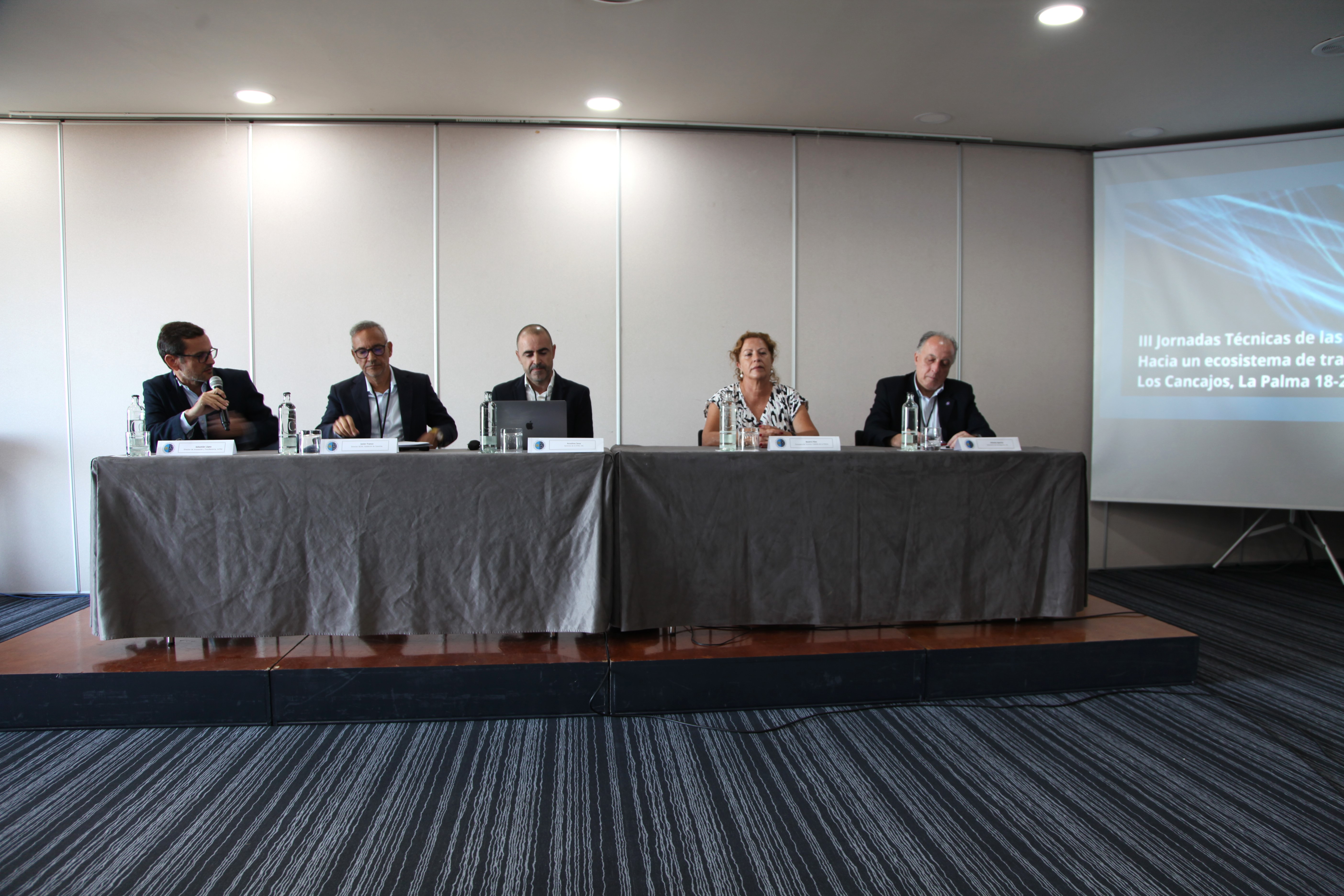 De izquierda a derecha: Sebastián López, director de Innovación y Transferencia, ULPGC; Javier Franco, director ACIISI, Gobierno de Canarias; Anselmo Sosa, gerente OTA del IAC; Beatriz Páez consejera de Turismo, Cabildo de La Palma y Antonio Aparicio, vicerrector de Investigación, ULL