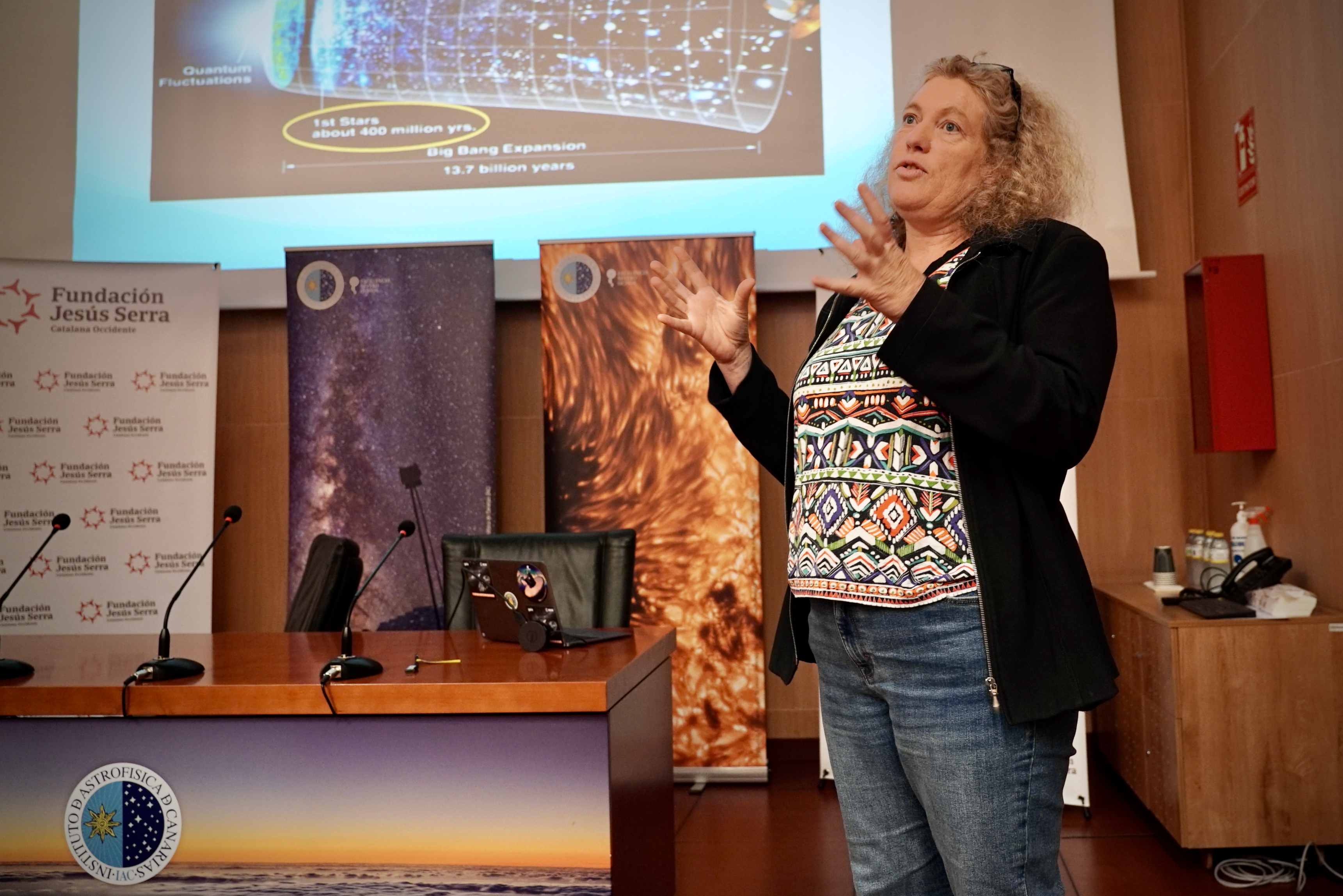 Vanessa Hill, directora de Investigación en el CNRS (Francia) e investigadora visitante del programa de la Fundación Jesús Serra (FJS), durante su presentación en la sede del IAC en La Laguna realizada con motivo de la firma del convenio entre la FJS y el IAC.