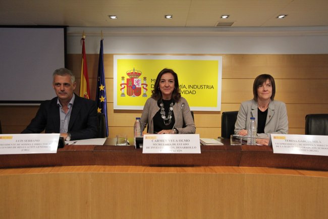 De izquierda a derecha, Luis Serrano, presidente de SOMMA y director del Centro de Regulación Genómica (CRG); Carmen Vela, secretaria de Estado de I+D+i; Teresa Garcia-Milà, vice-presidenta de SOMMA y directora de la Barcelona Graduate School of Economics (BGSE) en el acto de presentación de SOMMa, celebrado ayer en Madrid. Crédito: SOMMa.