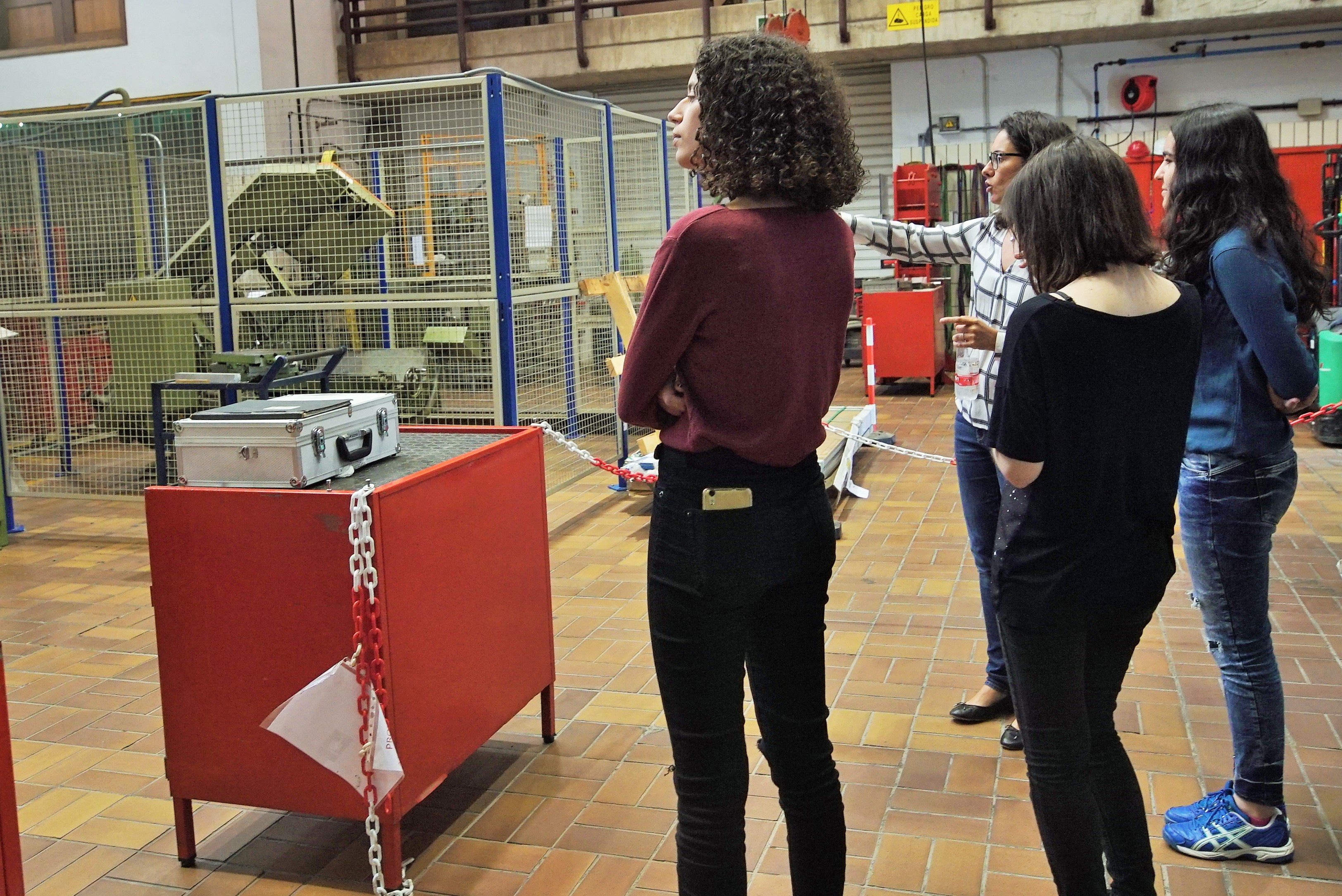 Las estudiantes del programa Canarias Masterclass durante su visita al taller de Mecánica, en la sede central del IAC en La Laguna, acompañadas de Sandra Benítez. Crédito: Tamara Muñiz Pérez (IAC).